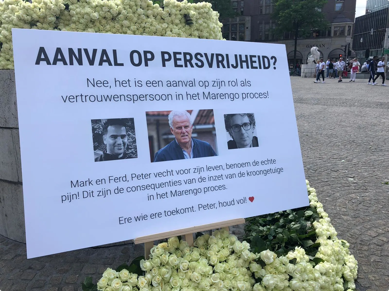 De Bloemleggers, naar eigen zeggen "een groep van bezorgde en betrokken burgers die zich zorgen maakt over de structurele naïeve opstelling vanuit de overheid tegenover de zware criminaliteit", leggen vrijdagmiddag op de Dam vierduizend witte rozen en een geschreven steunbetuiging neer voor Peter R. de Vries.