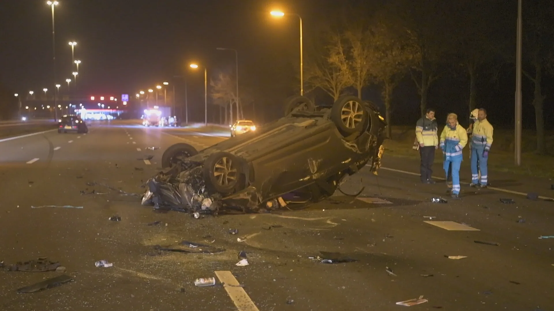 De politie trof niemand aan bij de auto die over de kop was geslagen. Daarop zijn een aantal ziekenhuizen gebeld. "De auto was behoorlijk gehavend, daar kom je niet zonder kleerscheuren uit", aldus de woordvoerder. Later bleek dat een man zich bij een ziekenhuis had gemeld. Hij verklaarde dat hij in de auto had gezeten. Het is nog niet duidelijk of hij de bestuurder was. De politie heeft hem opgezocht voor "tekst en uitleg", zei de woordvoerder. De oorzaak van het ongeval is nog niet bekend. Een andere persoon die bij de aanrijdingen betrokken was, is gewond per ambulance naar een ziekenhuis gebracht. Beeld: SQ Vision