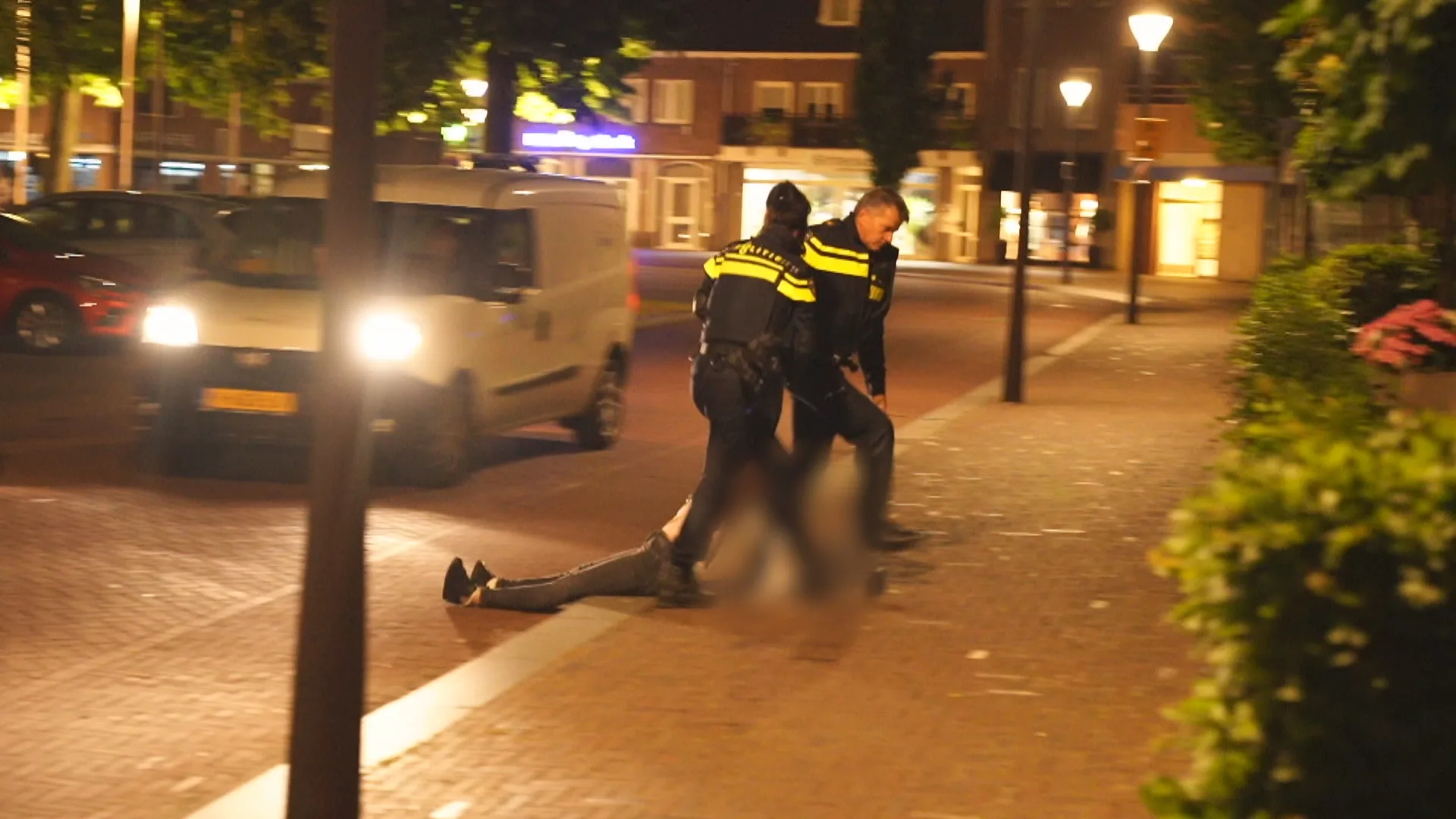 Na wat duw- en trekwerk wist de politie de tweede vrouw weg te sturen. Alleen besloot deze uiteindelijk om haar roes midden op straat uit te slapen. De politie heeft haar verplaatst naar de stoep. Nadat de schade was opgenomen en de auto was opgetakeld, lag de vrouw nog steeds op straat. Inmiddels was ze niet meer aanspreekbaar. Daarom heeft de politie een tweede ambulance laten komen. De vrouw is overgebracht naar het ziekenhuis in Eindhoven. Beeld: SQ Vision