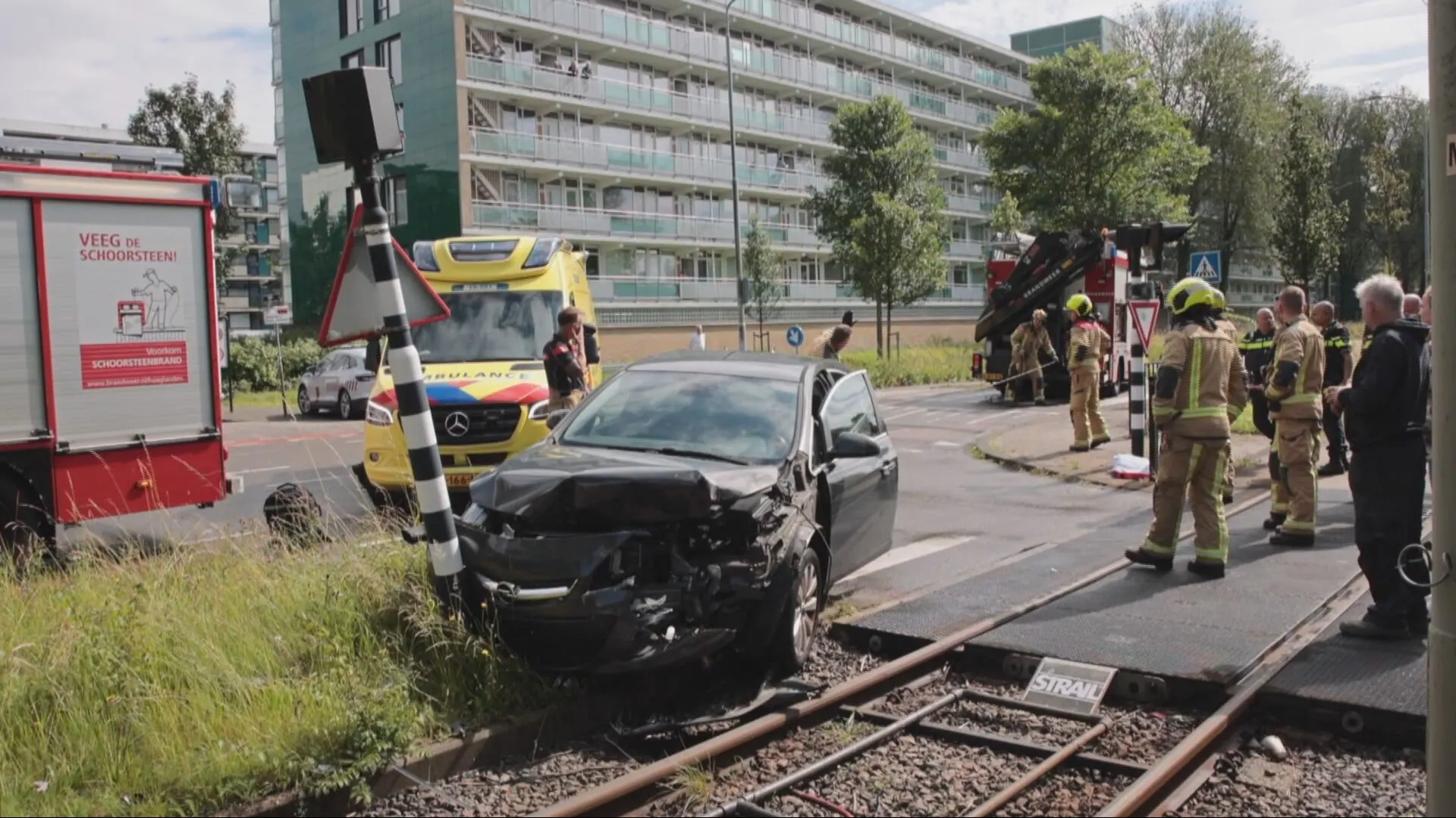 Door nog onbekende reden kwamen de twee voertuigen in botsing, waarna de auto tegen een verkeerslicht tot stilstand kwam. De bestuurder liep hierdoor een fikse hoofdwond op.