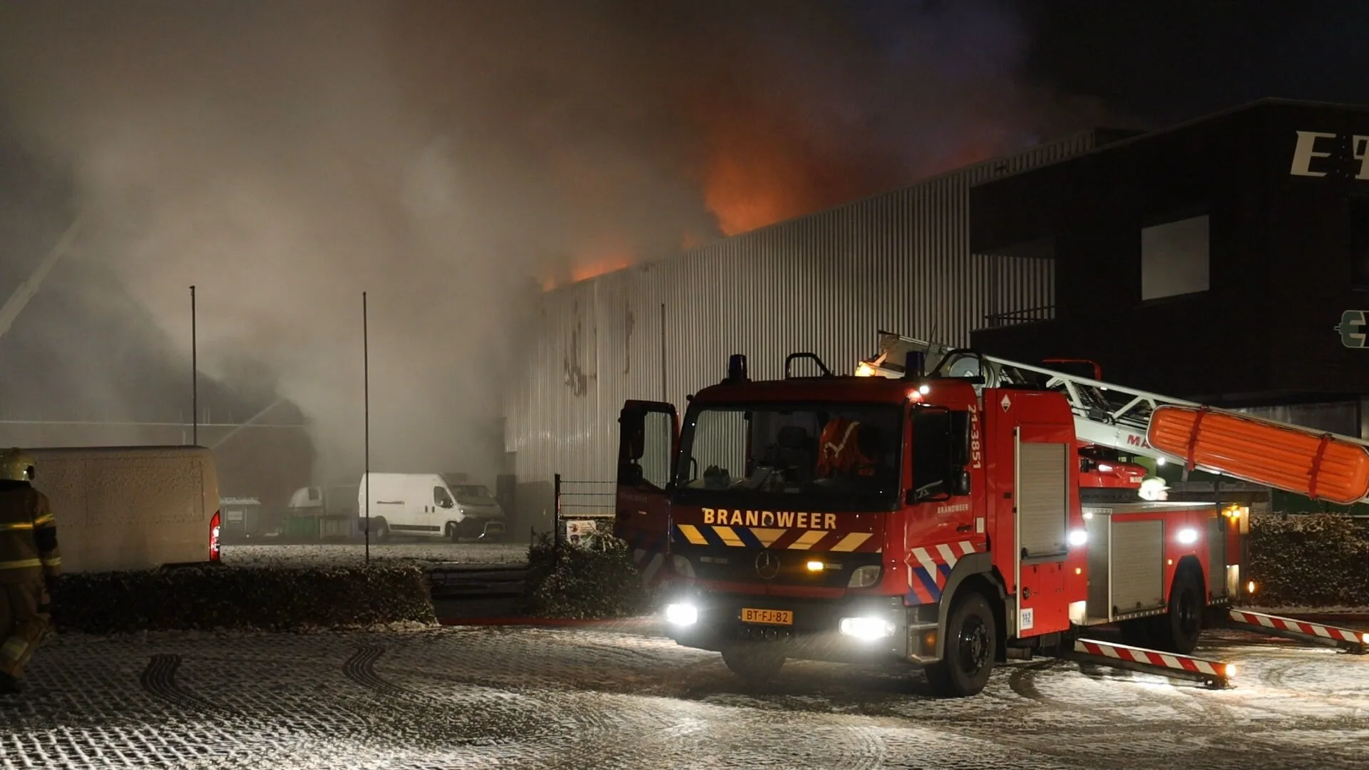 Het terrein is groot afgezet. De politie doet onderzoek naar de oorzaak van de brand.