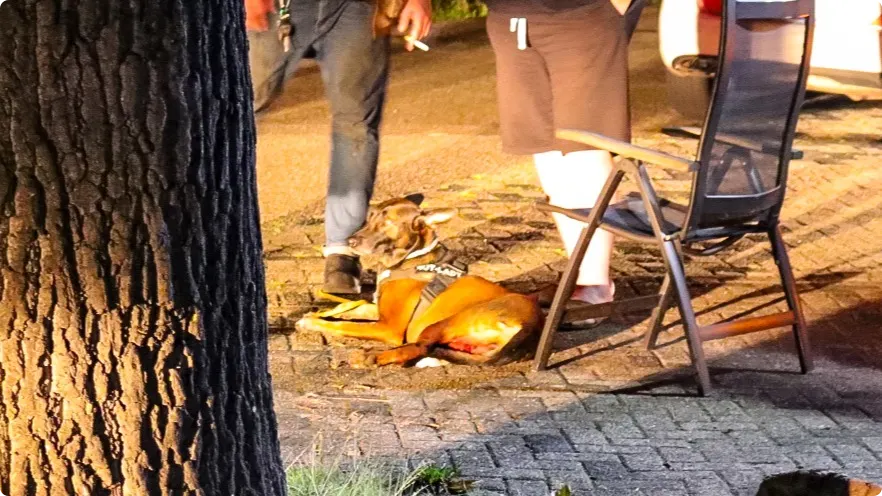 Bij het over de kop slaan van de auto werd de hond van de bestuurder uit de wagen geslingerd. Na een zoektocht van zo'n 15 minuten werd de hond zwaargewond aangetroffen. Het beestje zat volgens een verslaggever onder het bloed en was compleet versuft.