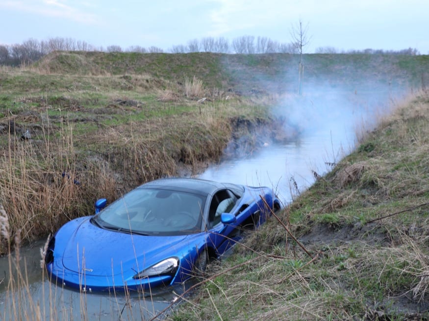 Op de Zoetermeerse Rijweg in Den Haag is een dure sportauto een sloot in gereden. Het zou om een auto van het merk McLaren gaan. In het water draaide de motor nog even door.
