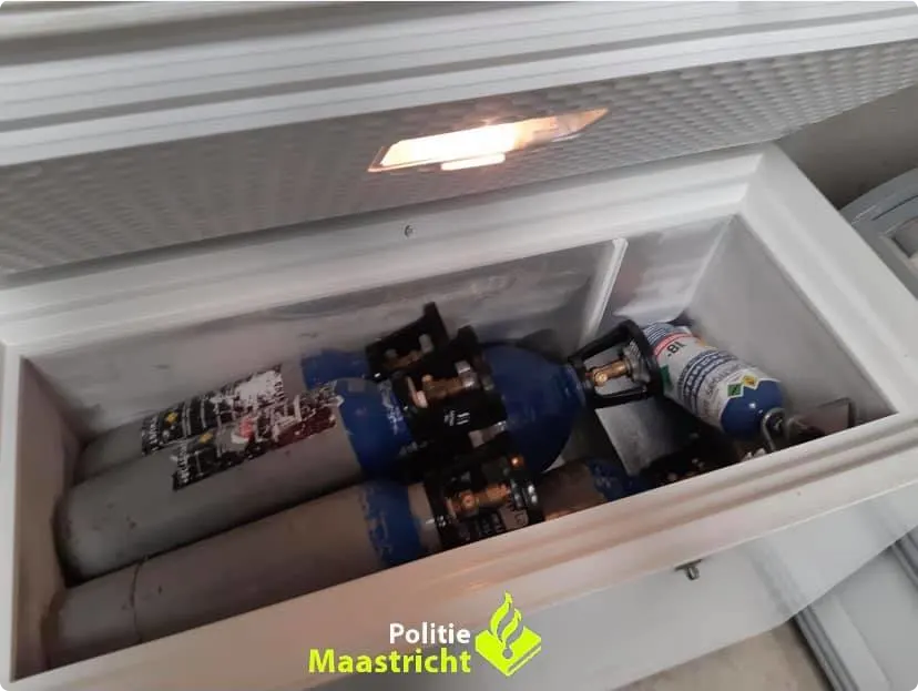 Agenten uit Maastricht, de gemeente en het Regionale Team Milieu brachten zaterdag een bezoek aan de woning. Ze stuitten daar op de enorme hoeveelheid lachgas. De flessen lagen onder andere in een koeling.