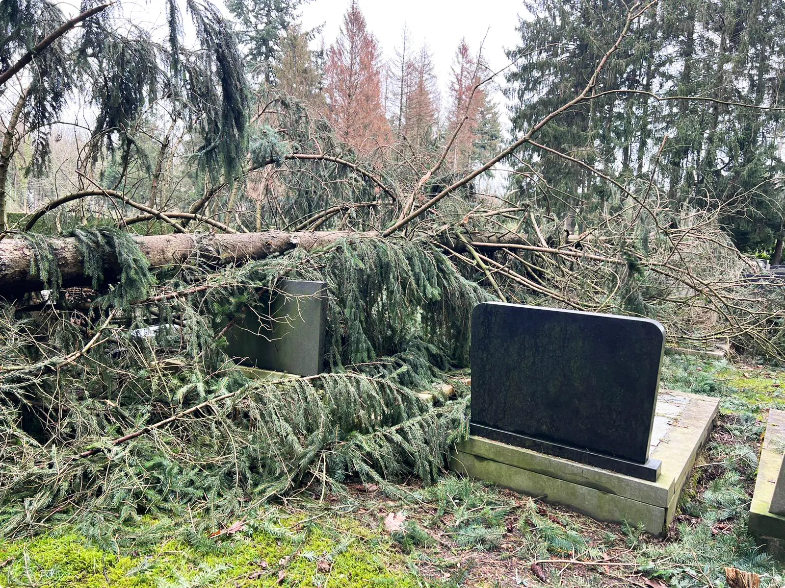 Een opzichter van de gemeente gaat dinsdag de schade opnemen maar verwacht wordt dat de schade oploopt in de duizenden of zelfs tienduizenden euro's. Op beelden is te zien hoe complete grafmonumenten zijn vernield door het natuurgeweld.