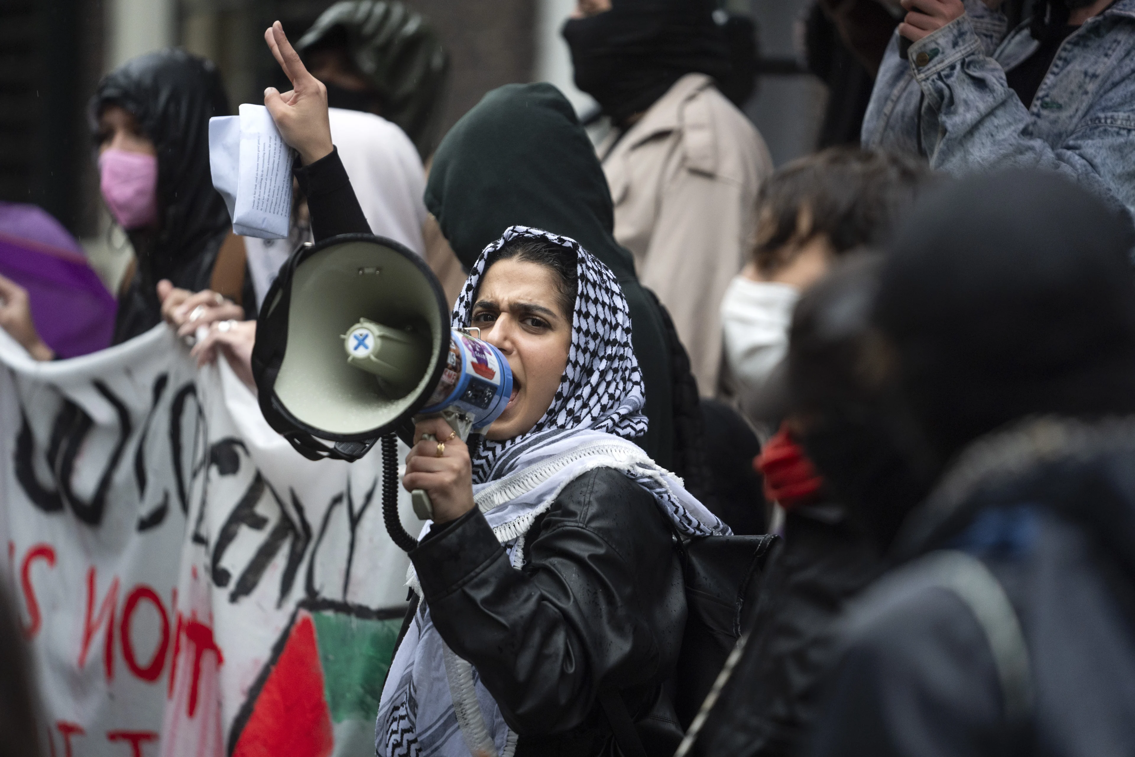 Na de vordering zijn de demonstranten met meer mensen voor de deur van het bezette universiteitspand gaan staan. Ook hebben ze een haag gevormd tegenover twee politiebussen die een straat naast het pand hebben afgezet.