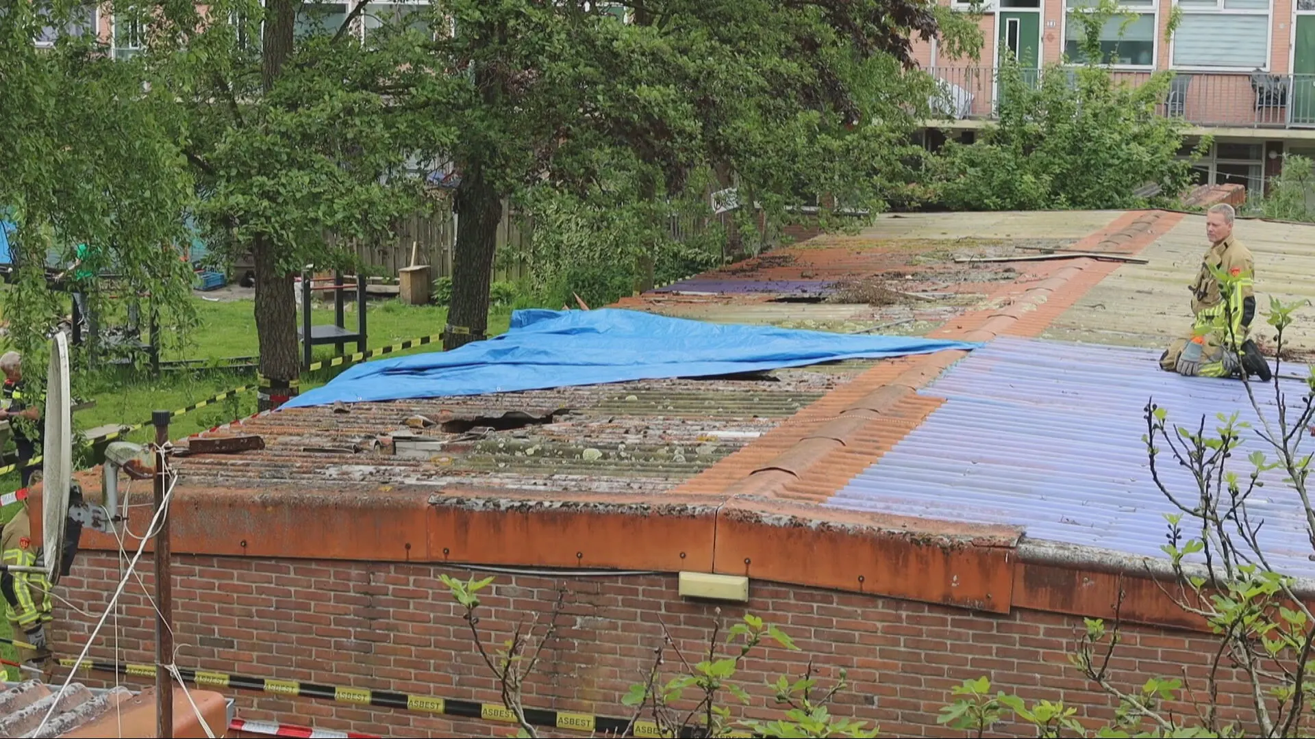 De schuur is afgezet met linten. Het zou kunnen dat er asbest in het dak zit, maar die kans is klein.