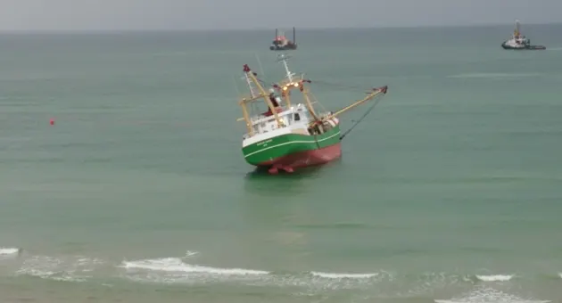 De bij de Deense kust vastgelopen Urker viskotter UK-172 is eindelijk weer los. Er is meerdere malen geprobeerd om de kotter, die door motorproblemen was afgedreven en daarna vastliep bij het strand van het Deense plaatsje Lyngby, los te krijgen maar dat heeft uiteindelijk een week geduurd. Er zaten zes mannen op het schip. Schipper Evert Bos vertelde zaterdag: "We hebben natuurlijk wel een hoop stress en adrenaline gehad deze week, maar we blijven het positief inzien." Lees ook: Nederlandse berger schiet te hulp: komt gestrande Urker viskotter nu eindelijk los? Bergingsbedrijf Multraship deed een ultieme poging de kotter los te krijgen, en dus met succes. Een eitje was het echter niet want het schip waarmee de UK-172 uiteindelijk werd losgetrokken kwam zelf ook bijna vast te zitten in het zand. Beeld: Dennis Fuhrmann