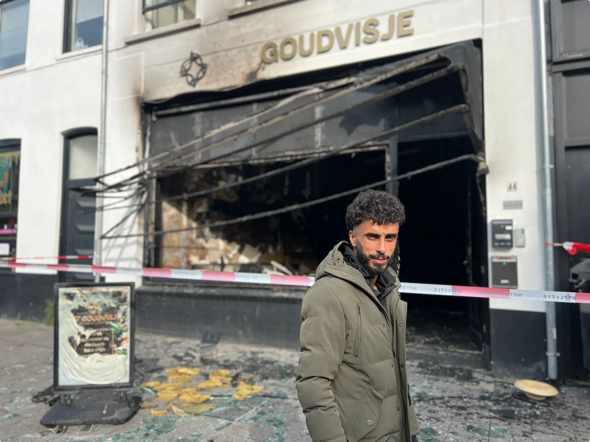 Mohamed Bittich, de eigenaar van de zaak, kijkt verloren naar de zwartgeblakerde gevel. Hij heeft een zware nacht achter de rug. "Het is wel een klap, maar we gaan proberen om er weer een mooie zaak van te maken."