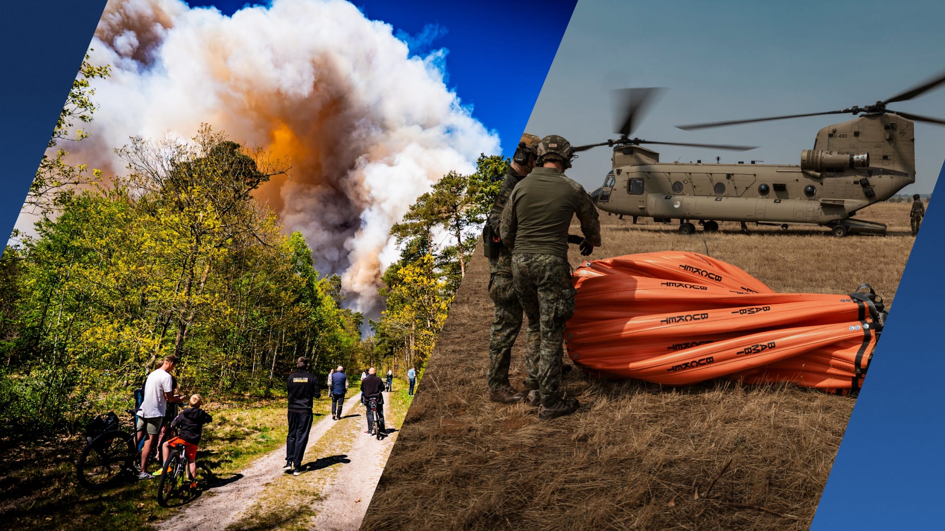 De luchtmacht zet Chinook-transporthelikopters in om te helpen bij de bestrijding van de brand. Dat meldt het Defensie Helikopter Commando op X. De helikopters dragen zogeheten Bambi Buckets onder zich mee. Die waterzakken kunnen gevuld worden in plassen die minstens twee meter diep zijn. Dat gebeurt zo dicht mogelijk bij de brand om tijd te besparen. Daarna wordt het water boven de brand weer uit de zak gelaten.