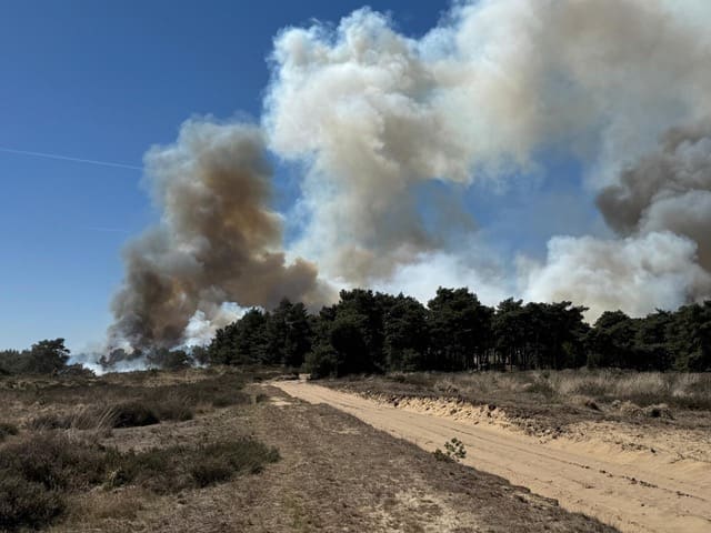 De brand woedt op een militair oefenterrein. Of het vuur beperkt is tot het oefenterrein bij de Geuzendijk, weet de woordvoerder niet zeker. Het vliegveld Kempen Airport, dat vooral wordt gebruikt voor recreatievluchten, wordt ontruimd. De rook trekt richting Budel.