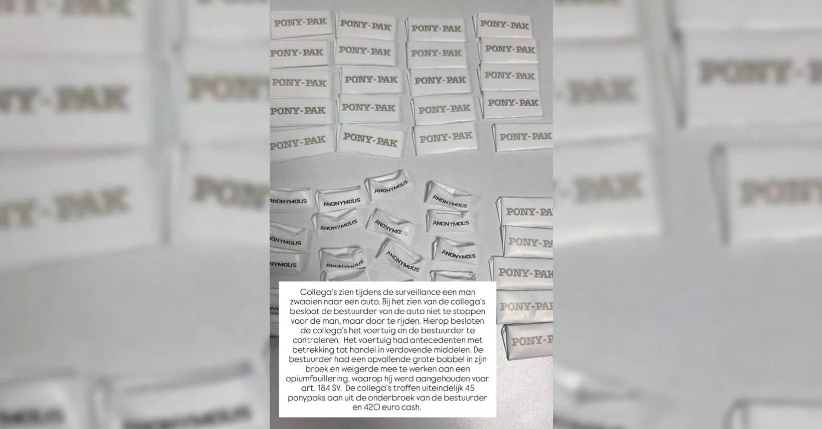 Uiteindelijk bleek dat de man 45 zogenoemde ponypacks drugs in zijn onderbroek had verstopt. Dit zijn gevouwen envelopjes die specifiek worden gebruikt voor het verpakken, bewaren en verhandelen van gebruikershoeveelheden poedervormige drugs. Ook had hij 420 euro contant geld bij zich. De politie doet verder onderzoek naar de zaak.