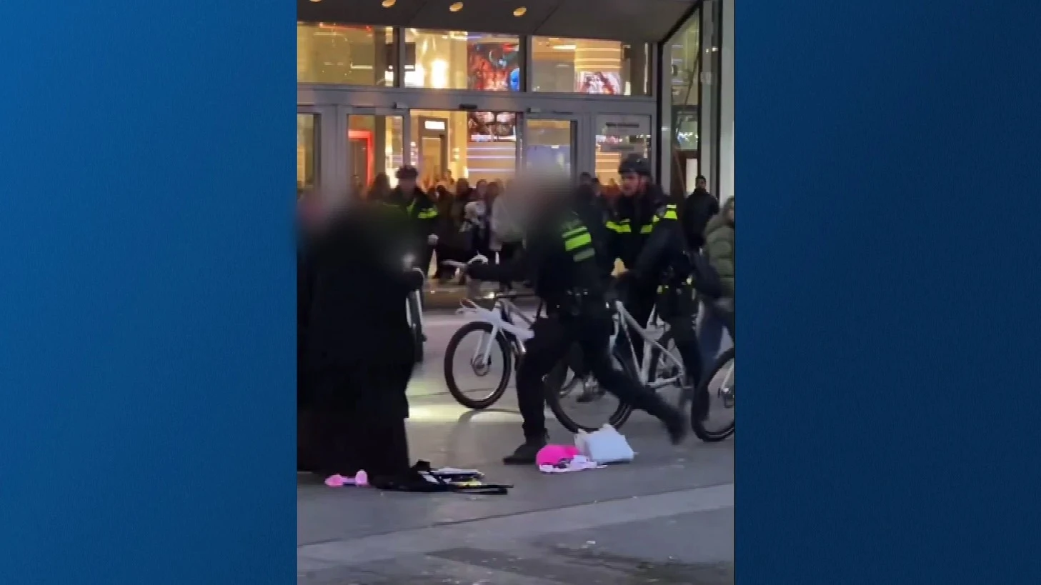 Op de beelden die maandag door omstanders zijn gemaakt, is te zien dat de agent een vrouw aan haar arm meeneemt. Een andere vrouw loopt achter hen aan met een telefoon in haar hand. Zonder zichtbare aanleiding geeft de agent haar een trap. Vervolgens ontstaat een chaotische situatie, waarbij de agent de andere vrouw slaat met zijn wapenstok, die hij al vasthield.