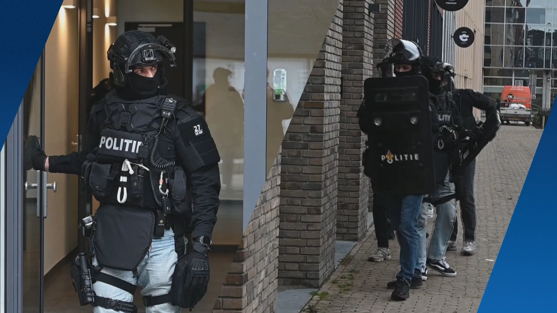 Op bovenstaande beelden van een correspondent ter plaatse is te zien dat meerdere agenten in kogelwerende vesten rond een appartementencomplex lopen. De een gewapend met een stormram, anderen met politieschilden. Iets later stappen ze in zwarte busjes en rijden ze weg.