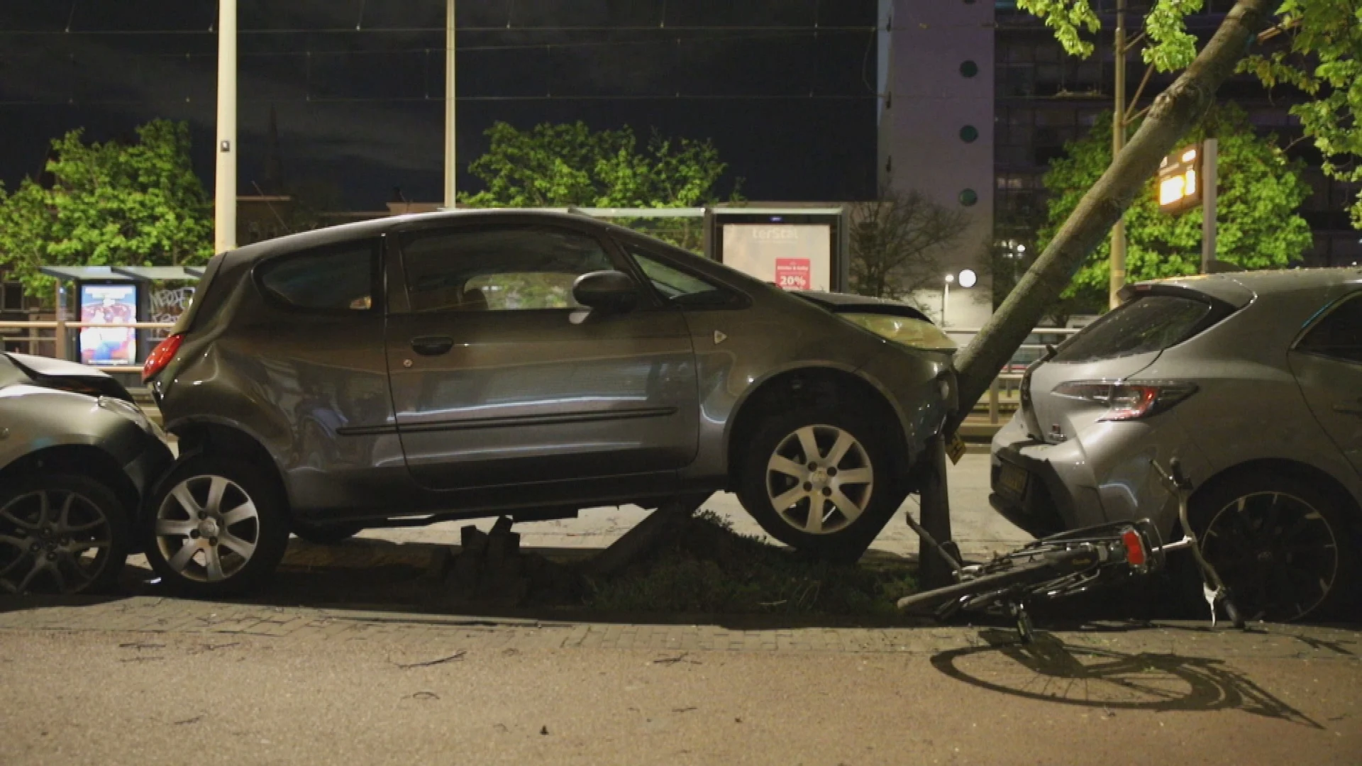 Door de harde klap werd de eerste geparkeerde auto tegen een tweede auto gedrukt die vervolgens tegen een boom knalde. Die boom raakte daardoor scheef en dreigde op een derde geparkeerde auto te vallen.