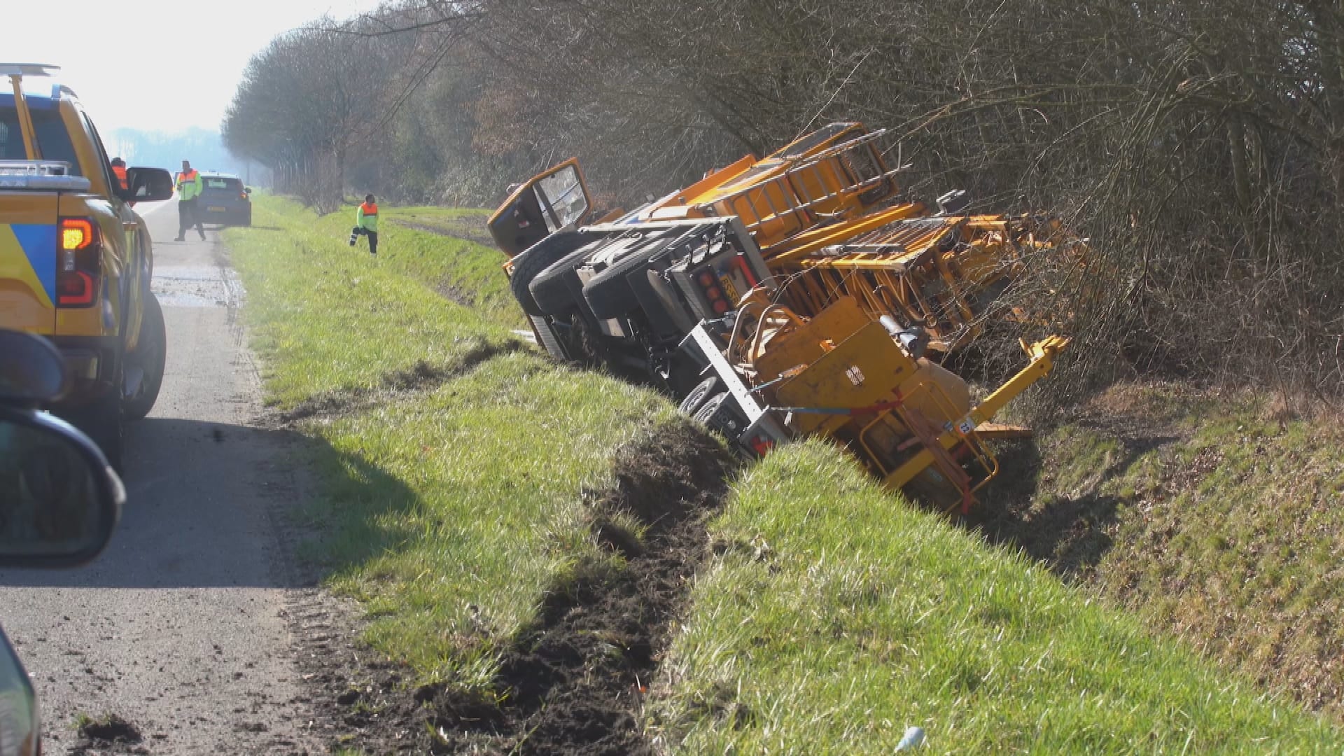 De chauffeur zou de macht over het stuur zijn kwijtgeraakt. De vrachtwagen zou geleidelijk de berm in zijn gereden en vervolgens in de greppel tot stilstand zijn gekomen. Volgens betrokkenen gaat het om een kraan van zo'n 40 ton. Er is sprake van flinke lekkage van olie in de sloot waar het voertuig ligt.
