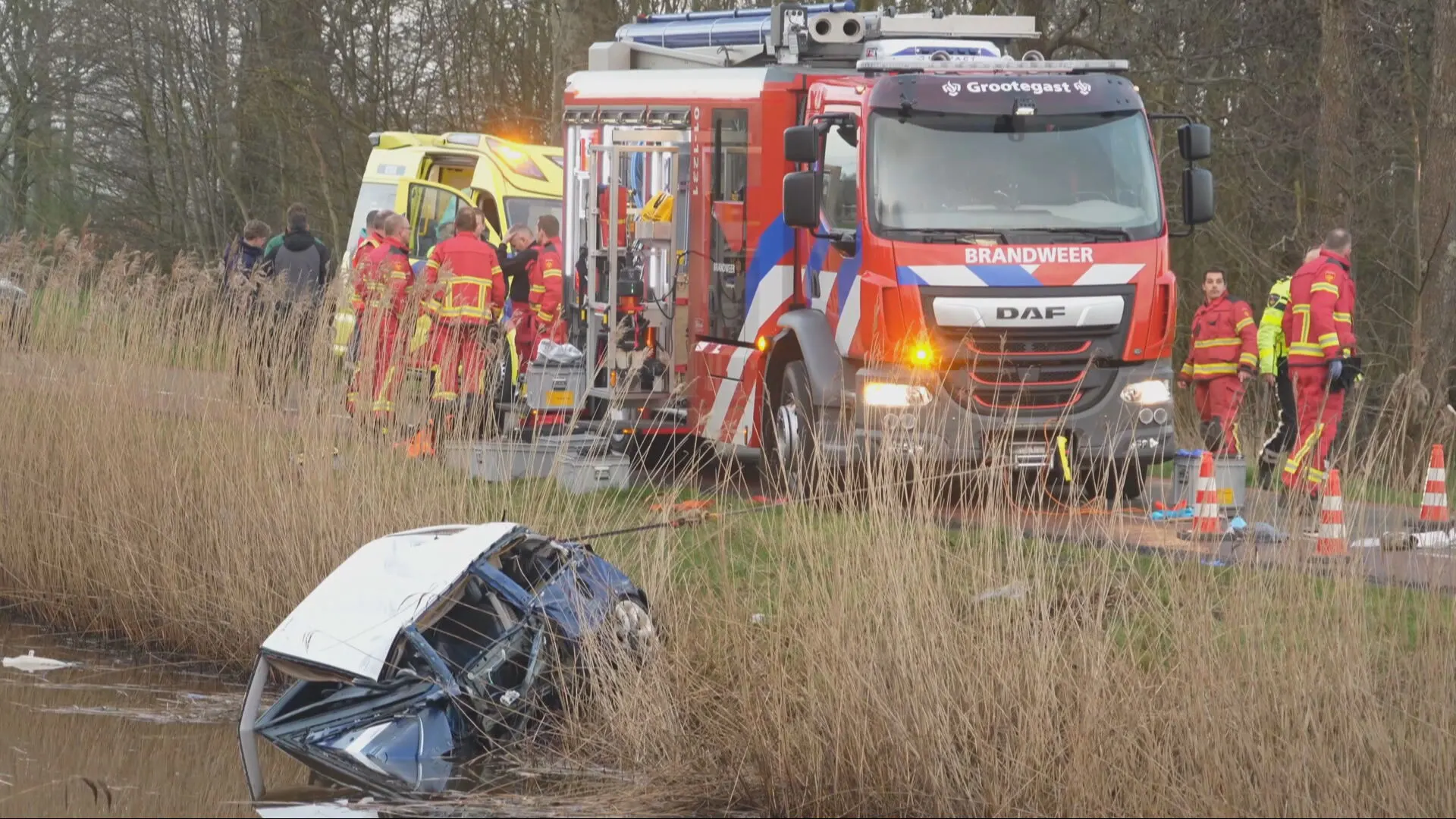 Het is niet duidelijk waardoor de auto te water raakte. Volgens lokale media heeft een omstander de auto met een tractor uit het water getrokken. Een van de inzittenden is er slecht aan toe.