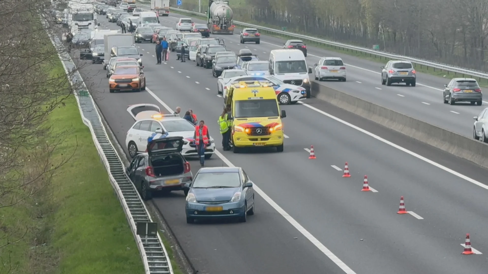 Rijkswaterstaat meldt dat drie auto's door een berger zijn meegenomen. Het lijkt vooral te gaan om materiële schade. Eén persoon is wel naar het ziekenhuis gebracht voor een medische controle.