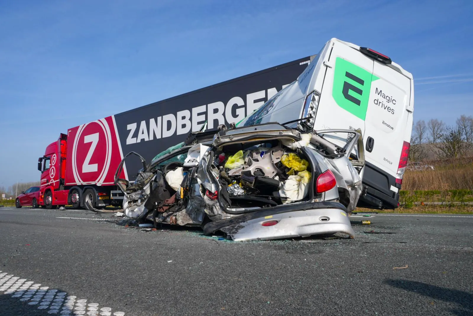 Ook een van de personenauto's liep flinke schade op door de botsing. Een andere auto belandde in de sloot langs de weg.