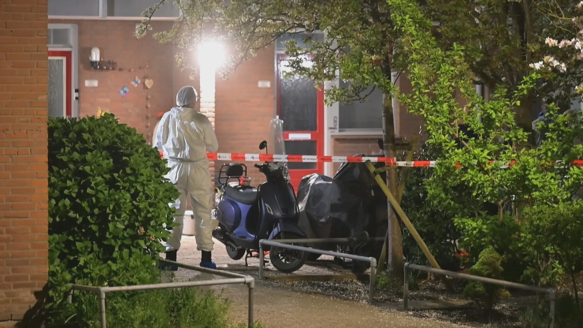 Een deel van de straat is afgezet met linten. Op beelden is te zien hoe rechercheurs in witte pakken in en uit de woning lopen.