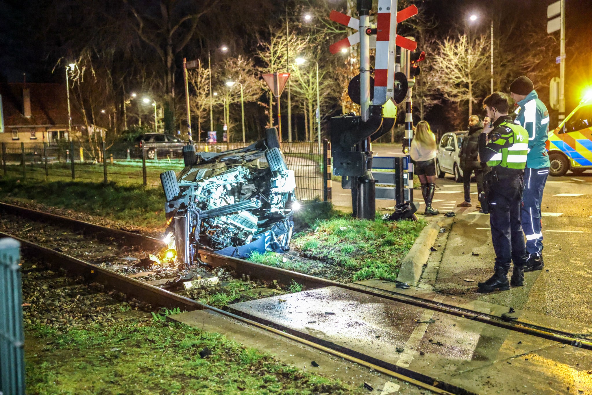 Een zware crash in Amersfoort heeft zaterdagavond voor grote schade en onrust gezorgd. Rond 23.50 uur belandde een auto ondersteboven op de spoorlijn bij de Ponlijn. De bestuurder is na het ongeluk gevlucht, waarna de politie een grootschalige zoekactie startte in de wijk.