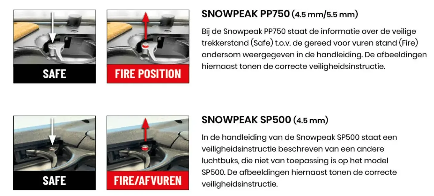 Bij de Snowpeak PP750 staat de informatie over de veilige trekkerstand (safe) ten opzichte van de gereed-voor-vuren-stand andersom weergeven in de meegeleverde handleiding.