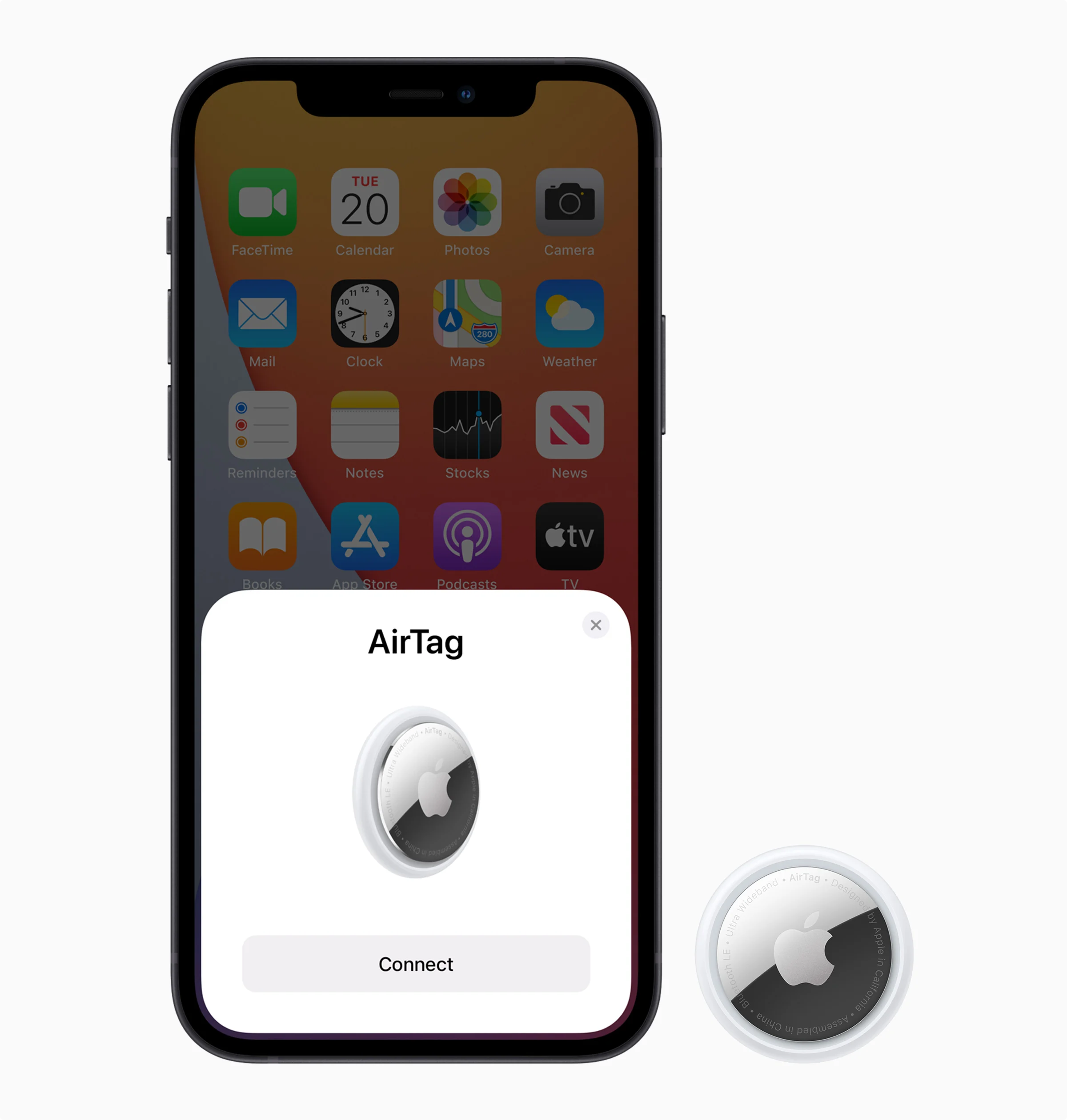 De AirTag is een schijfje dat aan bijvoorbeeld een sleutelbos, de halsband van de hond of in een portemonnee kan worden gestopt. Die tracker werd al een aantal keer verwacht maar is nu officieel aangekondigd. Eenmaal in gebruik kan het voorwerp waar het aan vast zit met de Vind mijn-app worden gezocht. Het product lijkt daarmee op vergelijkbare trackers van Tile en Samsung. Apple zegt dat er meer dan 1 miljard apparaten verkocht zijn die de signalen van de AirTags kunnen oppikken.