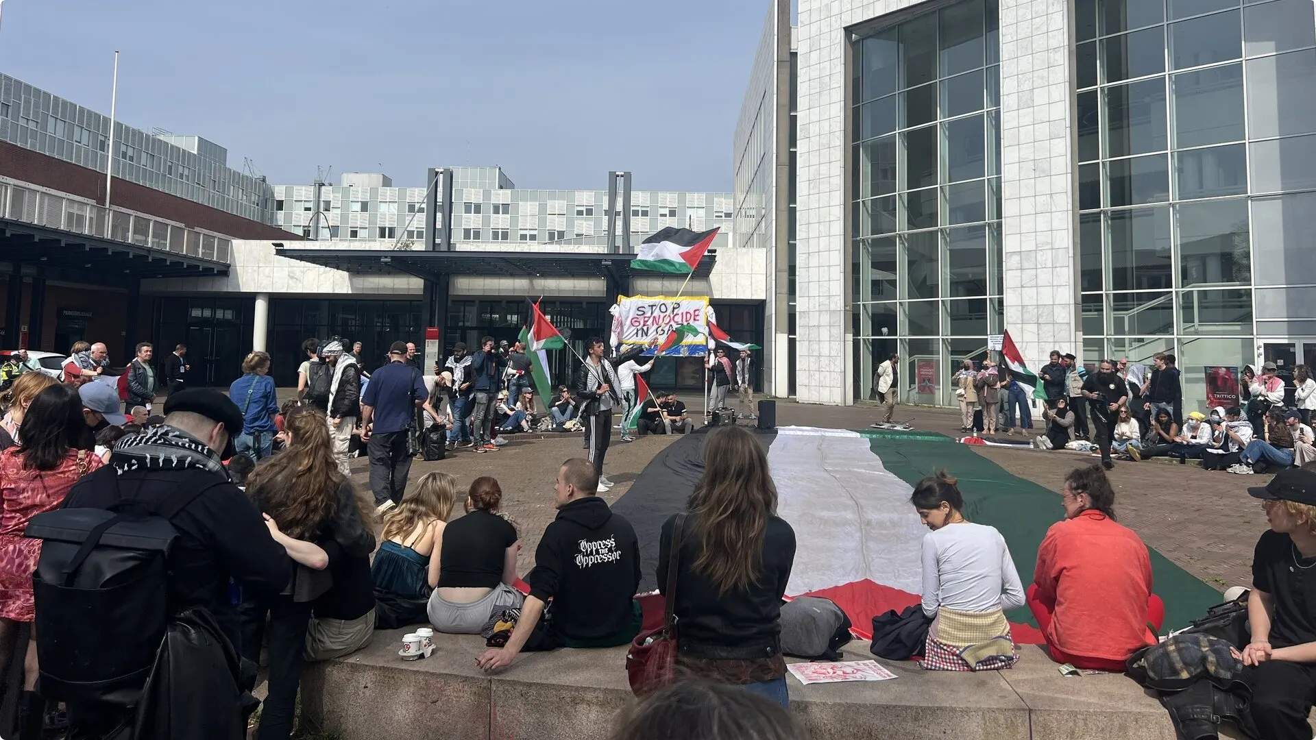 "Er is muziek en er wordt geklapt en gezongen", zegt een Hart van Nederland-verslaggever ter plaatse. Sommige betogers houden Palestijnse vlaggen omhoog en een aantal draagt keffiyehs, de veelal zwart-wit geblokte sjaals die vaak bij pro-Palestijnse protesten worden gedragen.