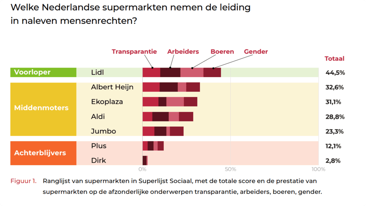 Het onderzoek, een initiatief van denktank The Questionmark, gesteund door Oxfam Novib en Solidaridad, toont aan dat Lidl het voortouw neemt, terwijl Albert Heijn, Aldi, Ekoplaza en Jumbo gemiddeld scoren. Plus en Dirk tonen de minste inspanningen op het gebied van mensenrechten.