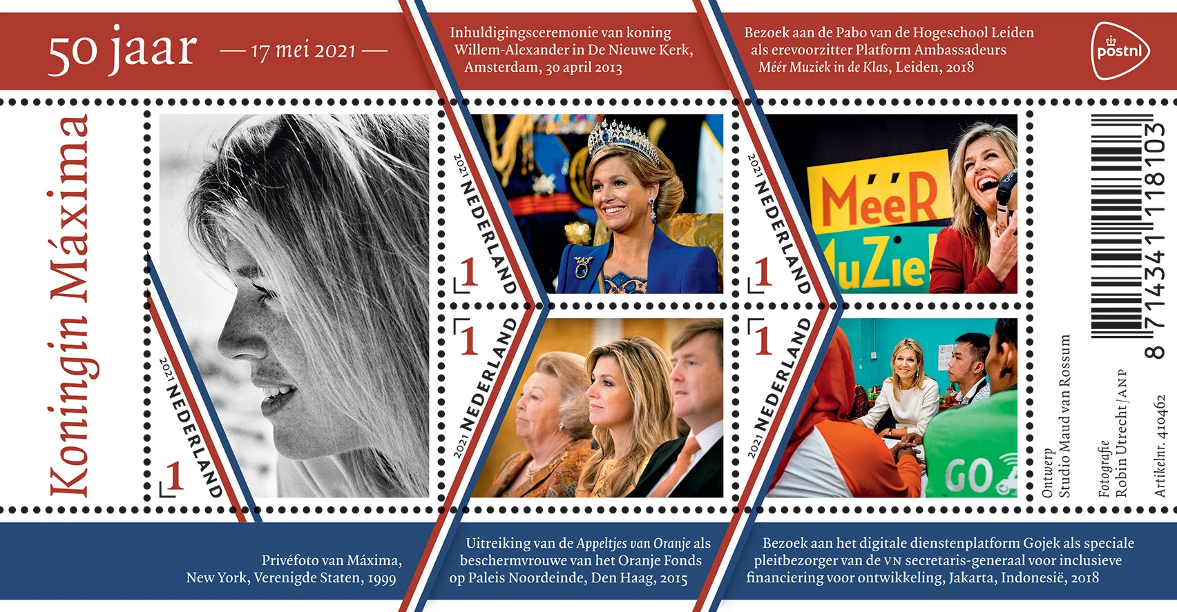 Het postzegelvel Koningin Máxima 50 jaar heeft een opvallende indeling doordat de postzegel met het zwart-wit portret van de koningin twee keer zo groot is als de postzegels met de kleurenfoto’s, aldus PostNL.