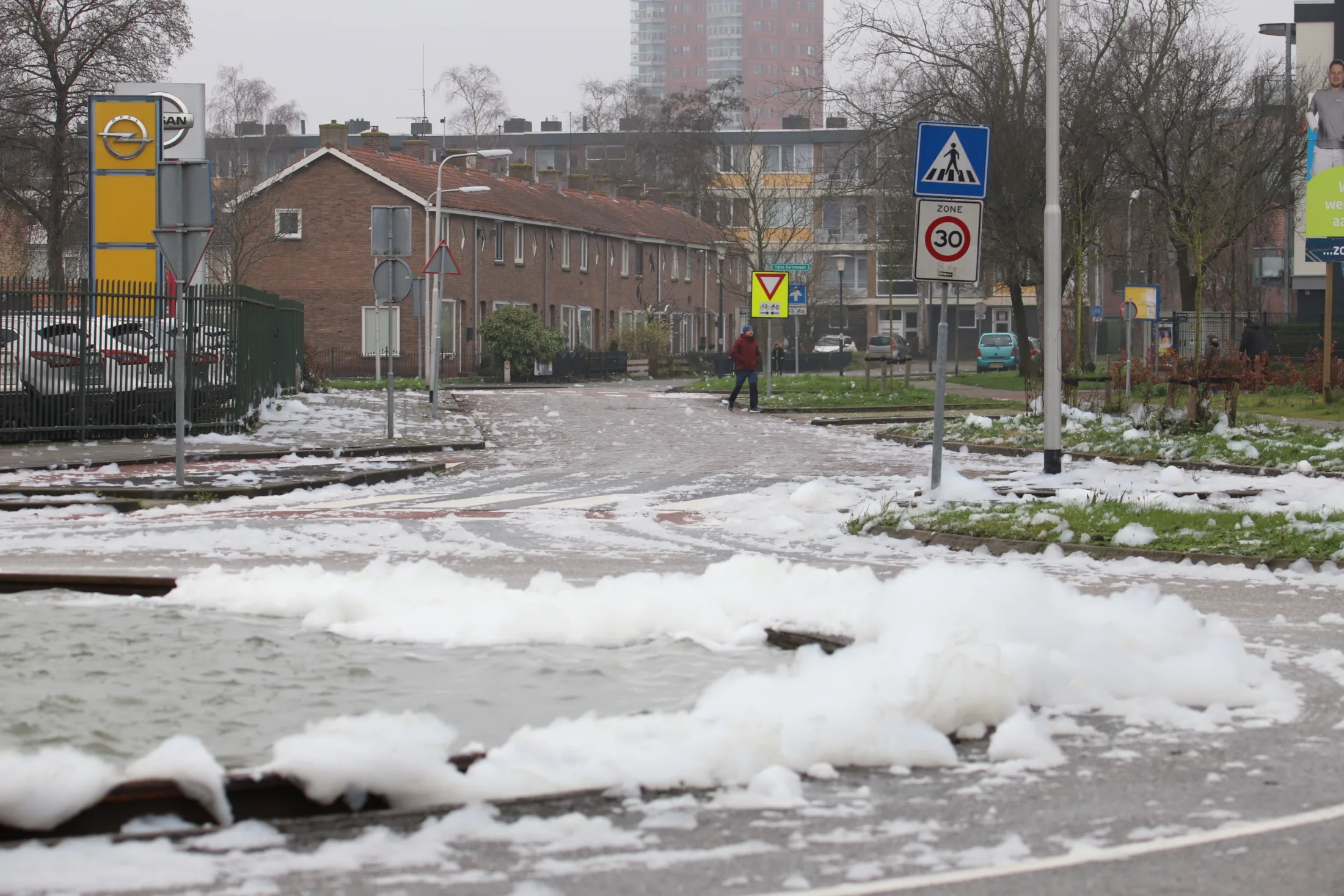 Het is onbekend wie er verantwoordelijk is voor het witte wonderland. Het is overigens niet de eerste keer dat er zeep of afwasmiddel in de fontein wordt gegooid. Beeld: Noormannen
