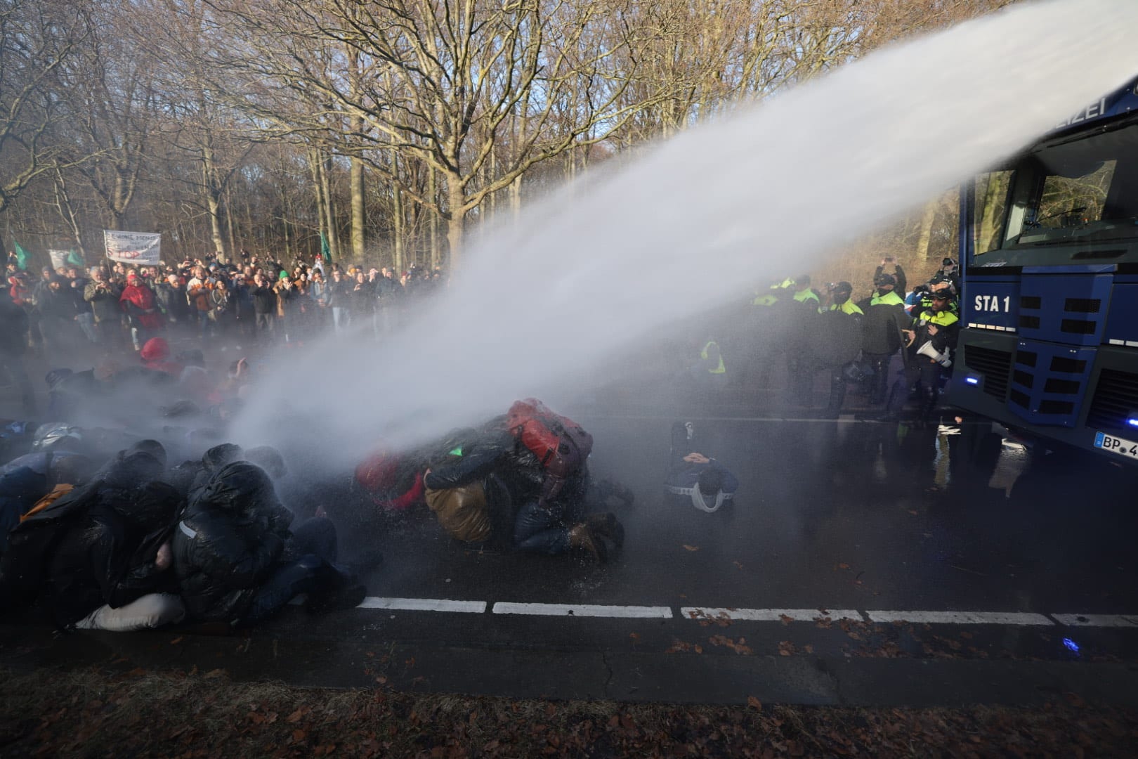 Activisten juichen iedere keer als ze natgespoten worden, sommigen zoeken de waterstraal zelfs bewust op. Velen die nog op de weg zitten of staan hebben poncho's bij zich. De demonstranten probeerden eerder het waterkanon te blokkeren. In een speech riep een actievoerder op om bij de inzet van het waterkanon, te gaan liggen en het hoofd te beschermen.