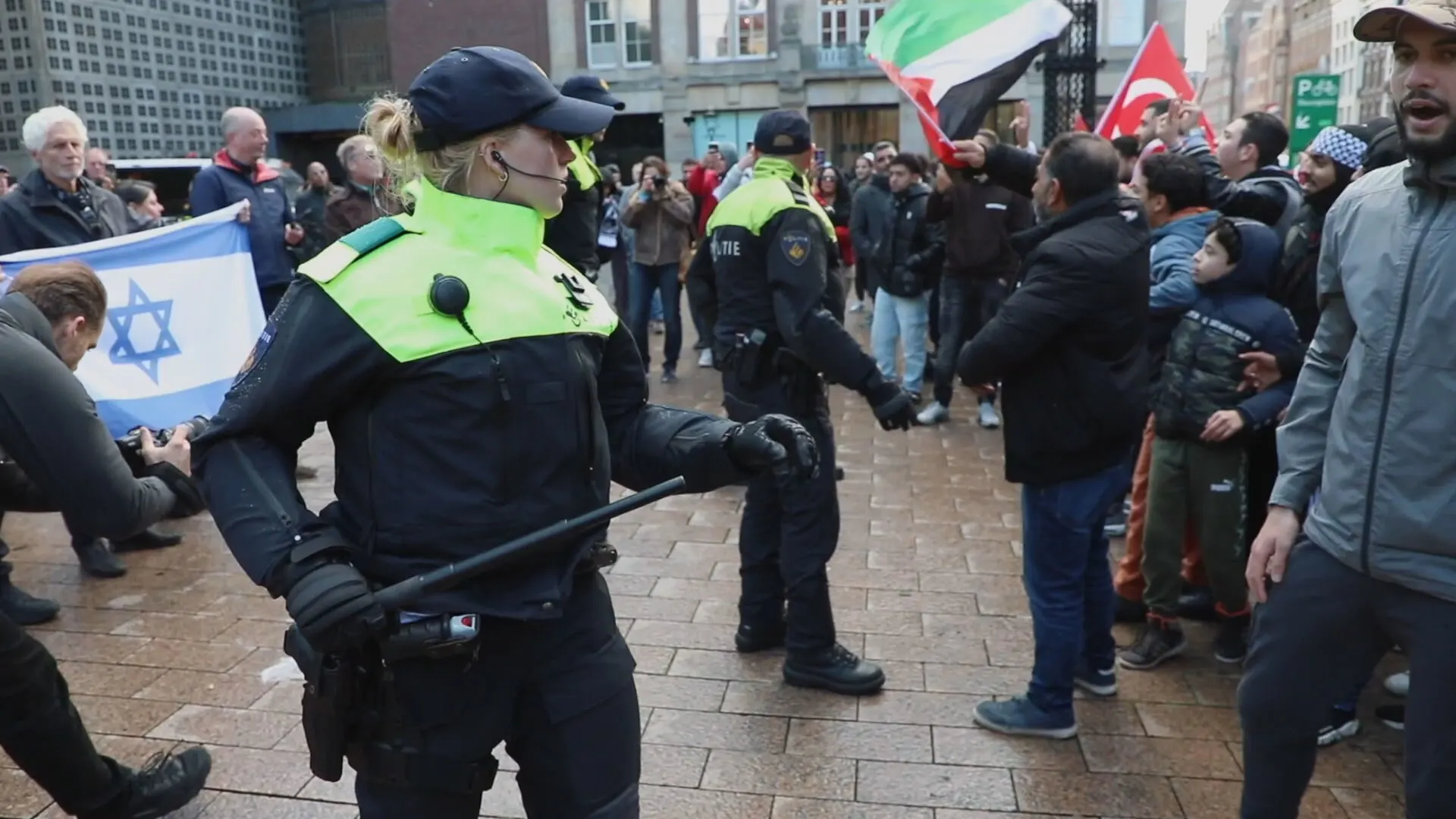 Zondagmiddag is ook een zogeheten pro-Palestina-mars bezig op de Dam in Amsterdam, waar duizenden mensen op af kwamen. De Dam ligt op zo'n 200 meter van het Beursplein vandaan. Volgens een woordvoerder van de politie kwamen steeds meer tegendemonstranten naar het plein, waardoor de spanning opliep. De ME werd ingezet om de twee groepen uit elkaar te drijven, zodat de situatie niet uit de hand liep.