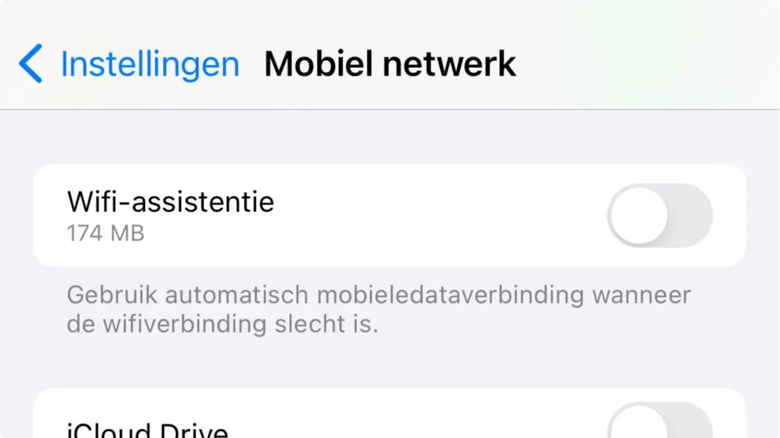 De boosdoener in dit verhaal is de functie 'Wifi-assistentie'. Klinkt handig, en dat is het ook wel, maar deze functie is tegelijkertijd een ware energieslurper. Wifi-assistentie zorgt ervoor dat je telefoon automatisch overschakelt naar mobiele data als je wifi-signaal zwak is. Handig als je bijvoorbeeld een video aan het streamen bent en je wifi hapert, maar dit kost dus ongemerkt veel batterij én data.