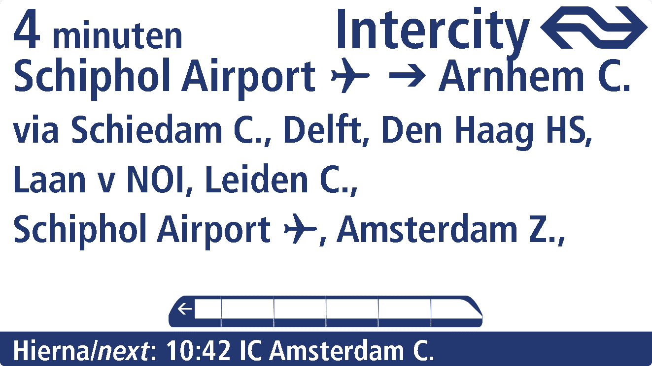 Verder komen er ook bestemmingen op de perronborden te staan die duidelijker zijn voor reizigers. Zo rijdt de trein van Rotterdam naar Arnhem bijvoorbeeld via Schiphol Airport. Voor veel mensen is dat echter verwarrend, merkt de NS. Ze verwachten namelijk niet dat een trein naar Arnhem via Schiphol rijdt (wat geografisch ook onlogisch is, red.).