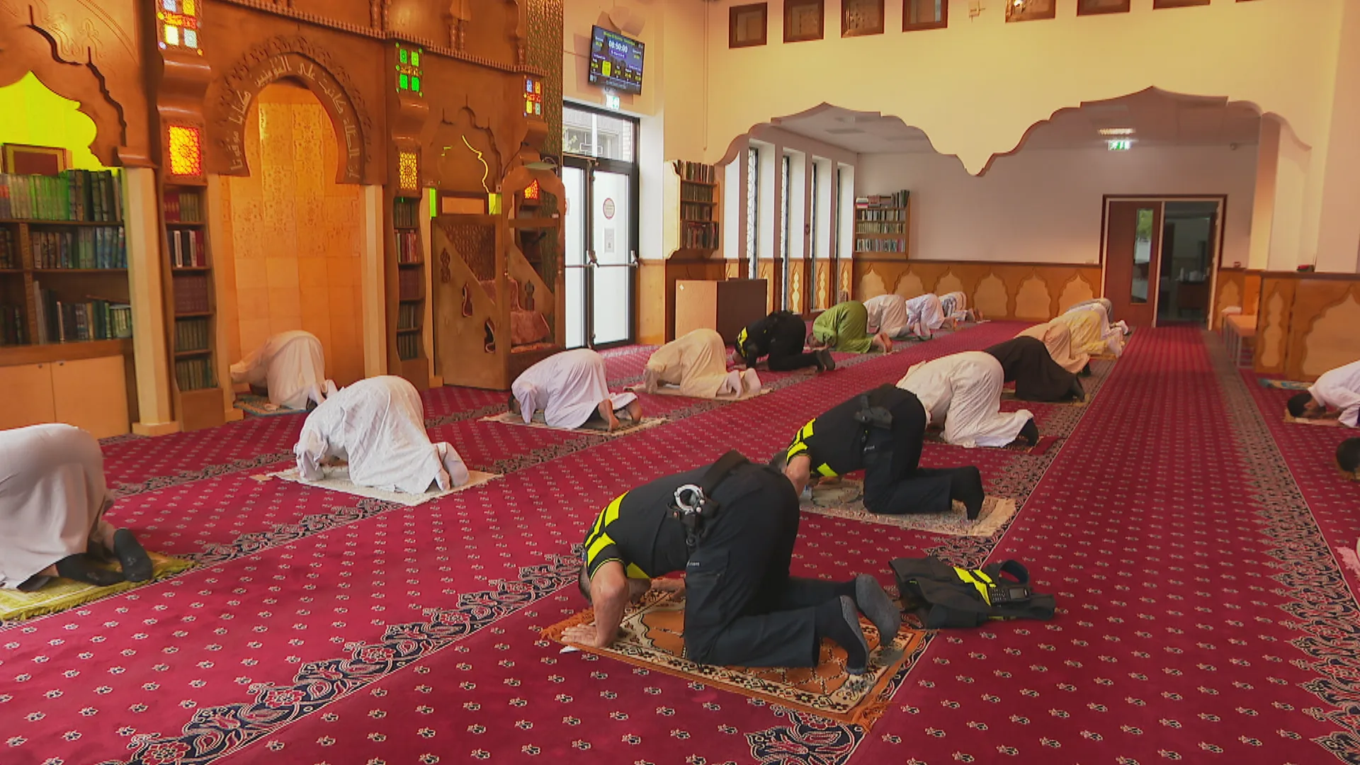 Op de kleinschalige bijeenkomst zijn onder meer medewerkers van de brandweer, politie en uit de zorg aanwezig. Zij worden op die manier bedankt voor hun harde werken de afgelopen maanden. "Het is een mooi gebaar dat mensen in vitale beroepen uitgenodigd zijn op deze mooie gezegende dag voor ons", aldus politieagent Abdul Salhi. "Op deze wijze hebben we toch nog een gebed in de moskee kunnen verrichten", valt collega Mohsin Ben El Faquih Akalay hem bij. Lees ook: Oproep aan ramadan-deelnemers met gezondheidsklachten: 'Wees extra voorzichtig' Ook hier worden de corona voorschriften streng gehandhaafd. Zo zijn de wasruimte en de toiletten niet beschikbaar en mogen er geen handen worden geschud. Boutzakhte wijst naar een grote televisie aan de wand. "We hebben op verschillende schermen een aantal aanwijzingen meegegeven. De mensen is gevraagd om op aangewezen plekken te bidden, bij voorkeur op een eigen gebedskleedje. En schoenen worden meegenomen naar binnen, zodat mensen via ingang A naar binnen kunnen en via uitgang B weer naar buiten gaan."