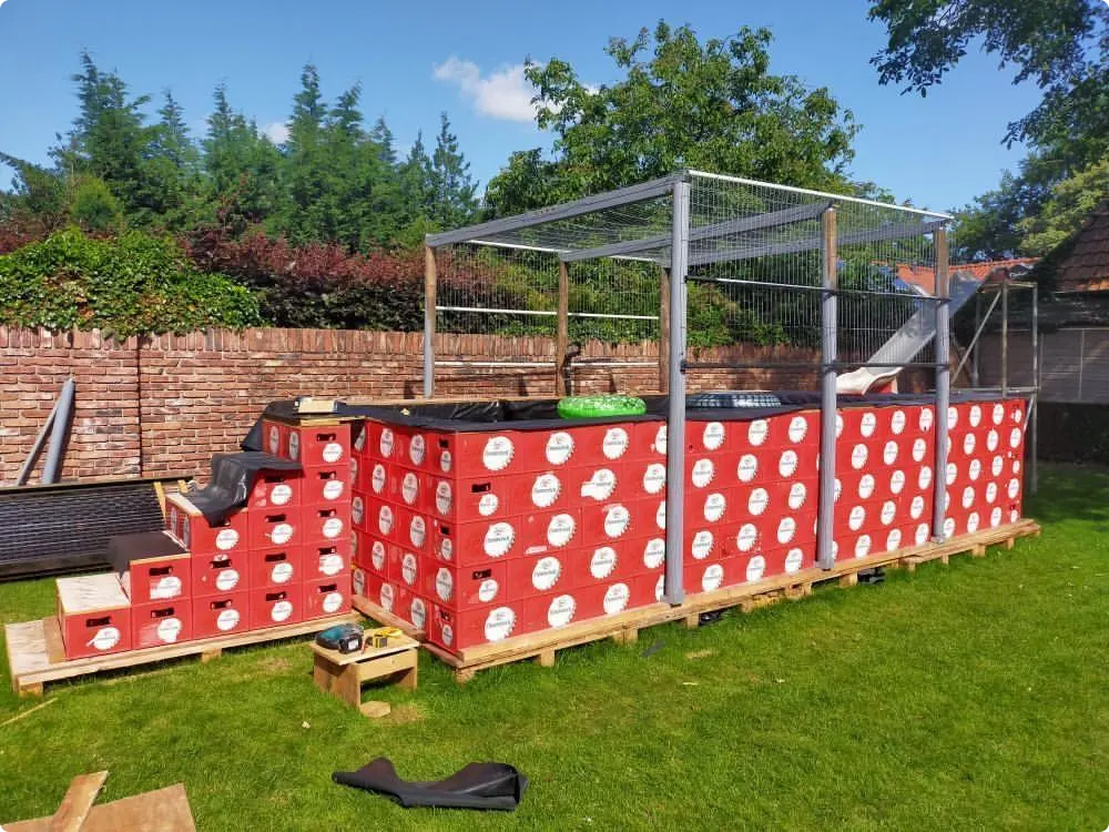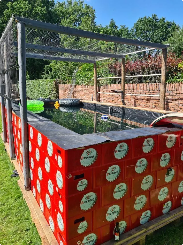 Waarom zou je 280 lege bierkratten inleveren bij de supermarkt, als je er ook een zwembad van kunt bouwen? Dat dacht een vriendengroep uit het Brabantse Westerhoven in februari. Na weken ploeteren mag het resultaat er zijn: in één van hun achtertuinen staat een waar zwemparadijs, inclusief glijbaan en bar.