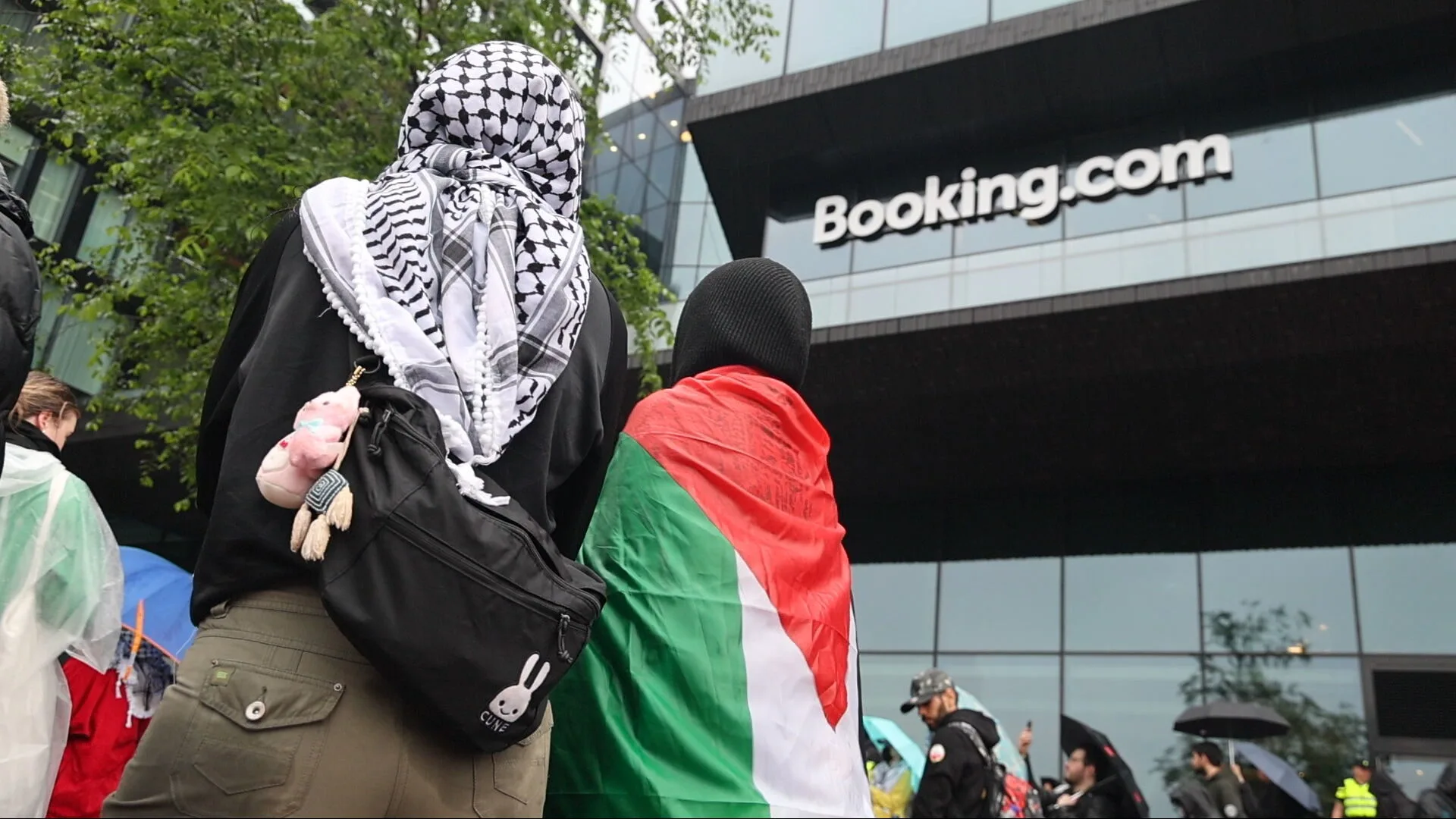 Bij het hoofdkantoor van Booking.com aan de Oosterdokskade in Amsterdam staat een groep van zo'n twee honderd pro-Palestinademonstranten. Ze vinden dat het boekingsplatform medeplichtig is aan oorlogsmisdaden van Israël, omdat het vakantieaccommodaties verhuurt op de Westelijke Jordaanoever.