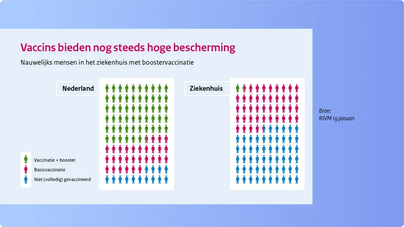 Half december had 5 procent van de mensen de boosterprik gehad, in tegenstelling tot de 55 procent uit de grafiek van Kuipers. De booster had in die periode alsnog een gunstig effect omdat slechts 1,5 procent van de bevolking in het ziekenhuis terechtkwam.