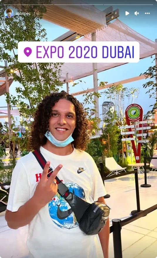 Ali poseert breedlachend op de Expo 2020 terwijl hij het vredesgebaar maakt met zijn vingers. Ook postte hij een korte video van de wereldtentoonstelling. Hij is daar zelf niet in te zien. De afgelopen weken was op verschillende juicekanalen te zien dat Ali al een tijdje in Dubai zit. Zo plaatste onder anderen Yvonne Coldeweijer foto's van de rapper.