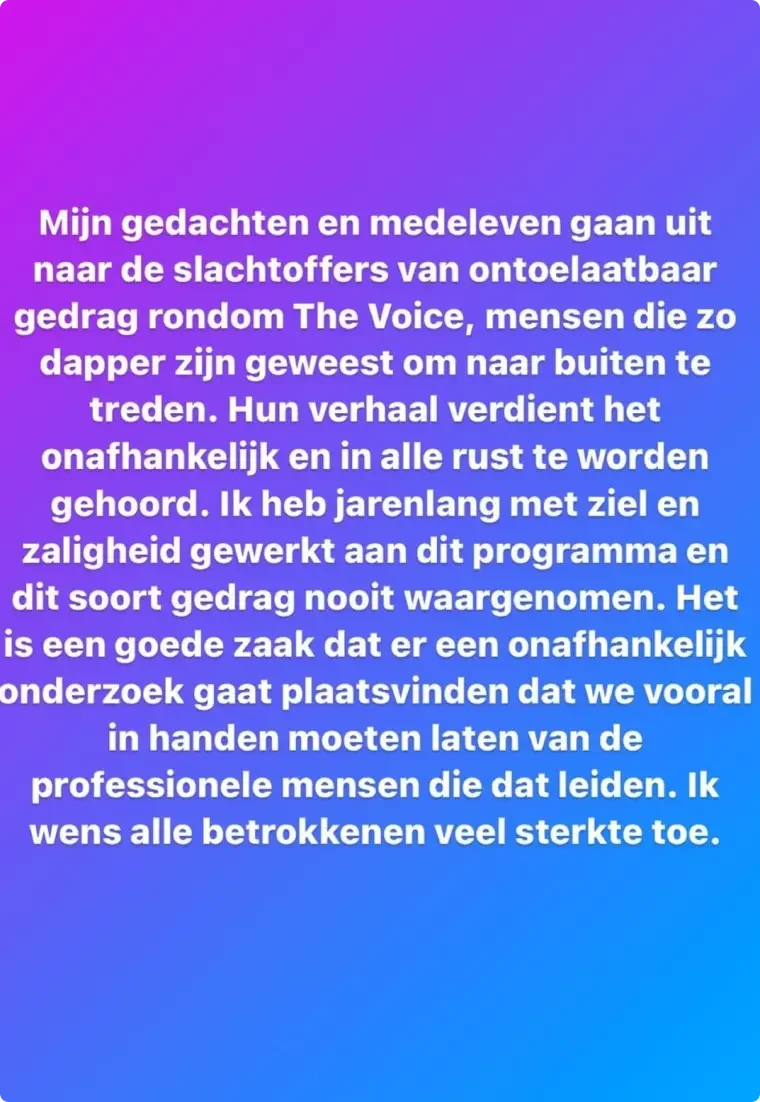 In haar Instagram Stories schrijft ze onder meer dat zij in haar tijd "dit soort gedrag nooit waargenomen" heeft. Ook Wendy is ontzettend geschrokken en vindt het goed dat er een onafhankelijk onderzoek komt. "Ik wens alle betrokkenen veel sterkte toe."