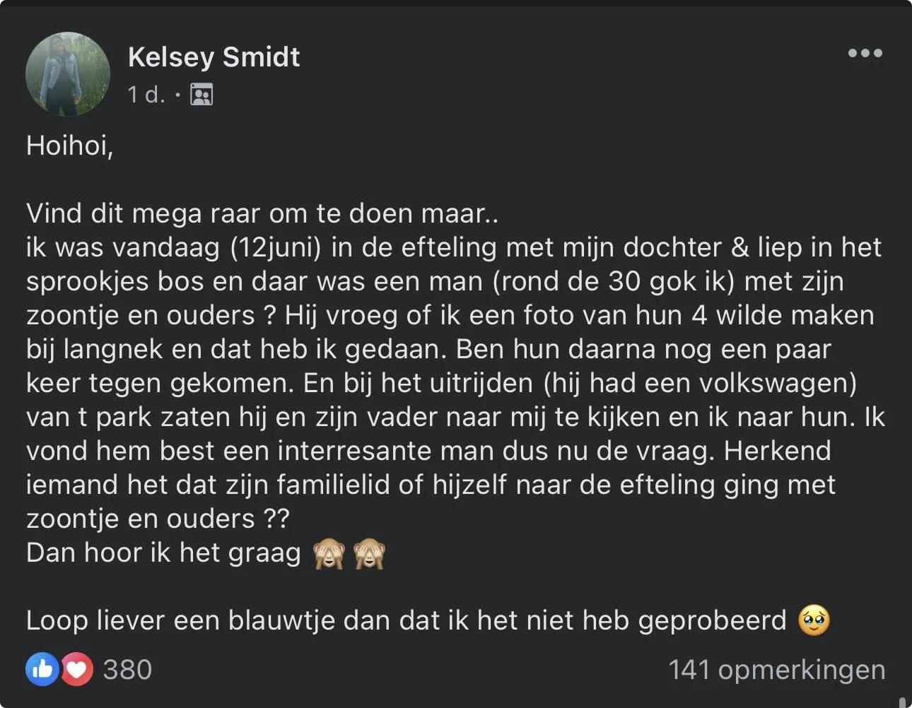 Meteen na thuiskomst van de Efteling plaatste Kelsey berichten op Facebook, in verschillende besloten moedergroepen en tientallen Efteling-pagina's, maar tot nu toe zonder succes. "Normaal ben ik niet iemand die dit soort dingen op Facebook zet, maar ik dacht: misschien kent iemand die man wel", vertelt Kelsey. Ze heeft zelfs de Efteling gebeld, maar vanwege privacyregels konden zij haar niet helpen.