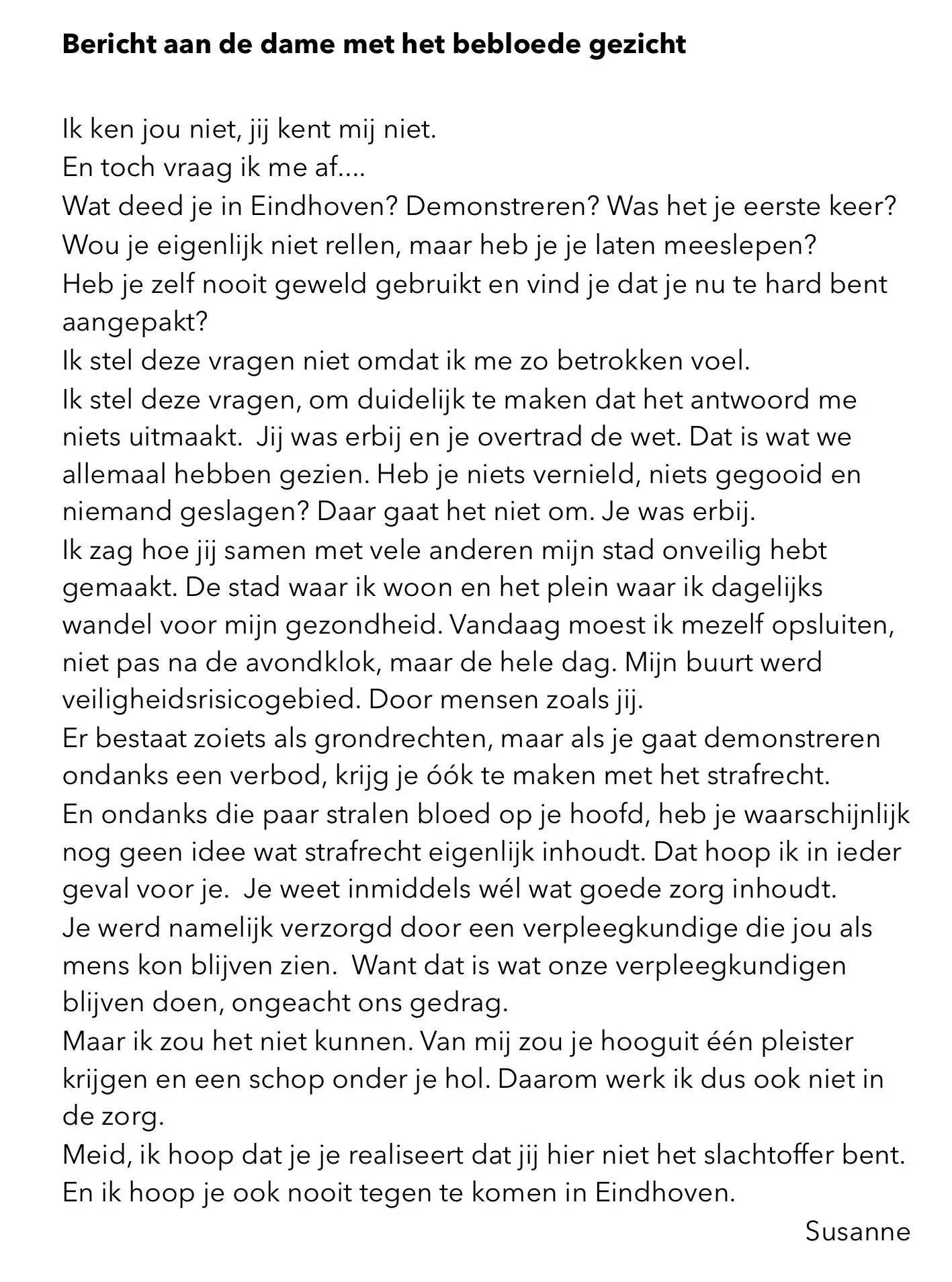 De Eindhovense Susanne zag haar stad zondagmiddag veranderen in een oorlogsgebied. Ze wist zich even geen raad met haar emoties en schreef een brief aan de vrouw die door een waterkanon van de politie in het gezicht werd geraakt. "Ik hoop dat je je realiseert dat jij hier niet het slachtoffer bent."