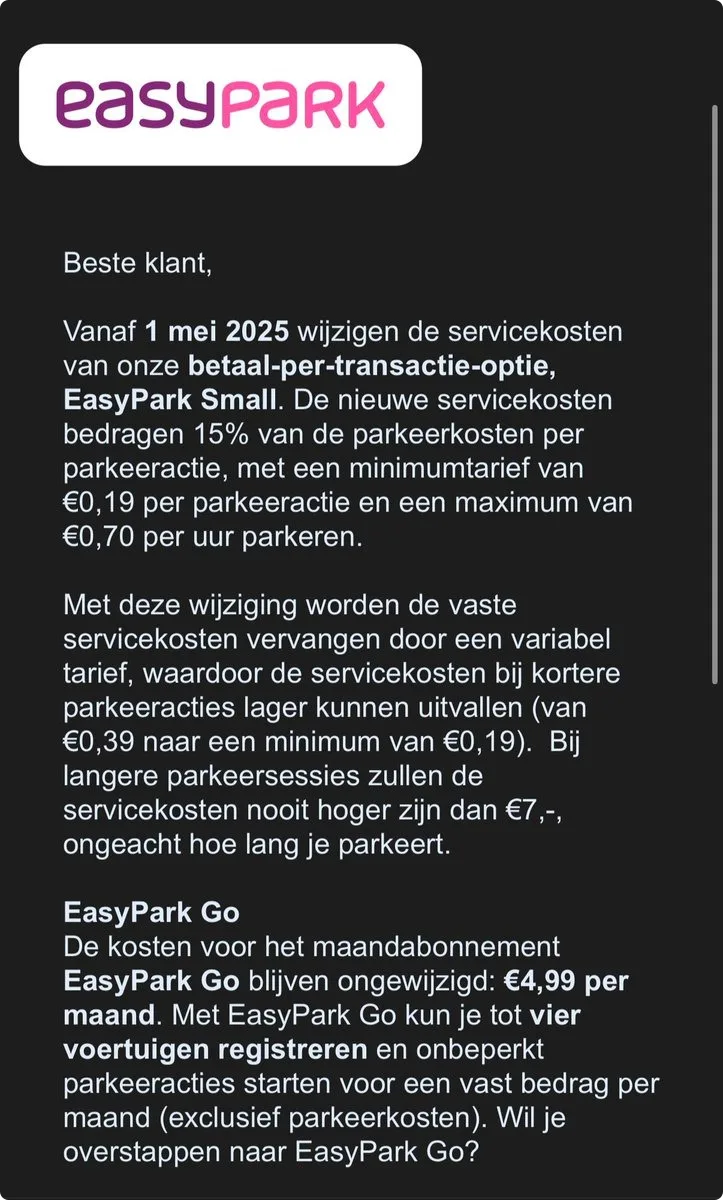 "Of het is een hele slechte 1 aprilgrap, of ze willen bij EasyPark graag van klanten af," schrijft een gebruiker op X. EasyPark bevestigt in een e-mail die naar alle gebruikers is gestuurd dat het echter geen grap is, maar een aanpassing naar "de standaard prijsstructuur" in andere Europese landen. Ook heeft het bedrijf een speciale pagina aangemaakt op hun site waar de prijsverhoging en verschillende scenario's worden uitgelegd.