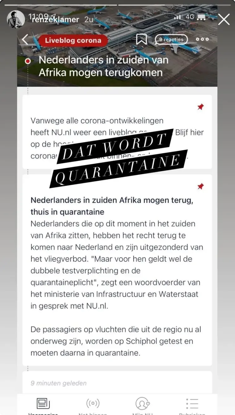 Diverse bekende Nederlanders zijn vrijdag overvallen door het nieuws dat vluchten uit zuidelijk Afrika zijn verboden in verband met de nieuwe, vermoedelijk besmettelijkere variant van het coronavirus die er is ontdekt. Onder anderen presentator Renze Klamer en bioloog/presentator Freek Vonk laten via sociale media weten dat ze in Afrika zitten.