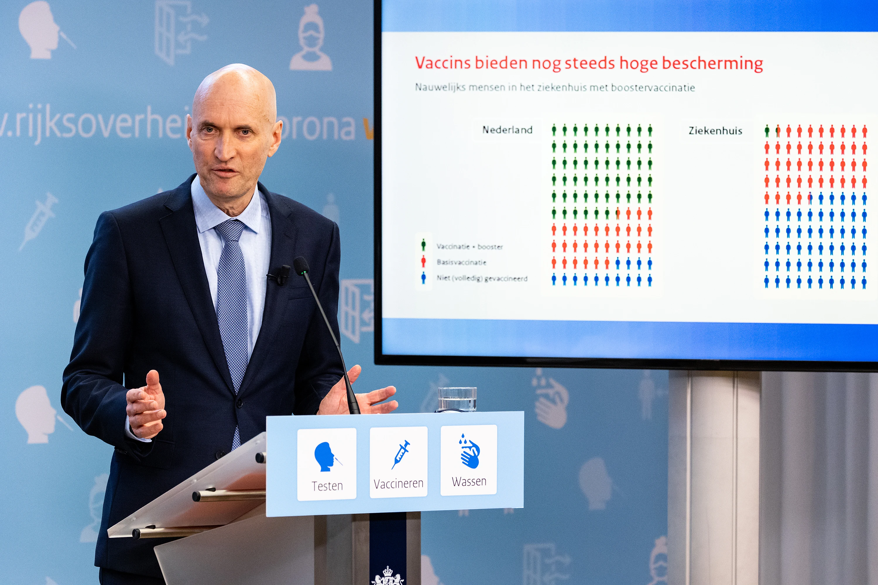 De grafiek die minister Ernst Kuipers dinsdagavond liet zien tijdens de coronapersconferentie, geeft geen eerlijk beeld. De grafiek liet zien dat er, in vergelijking met heel Nederland, relatief weinig mensen na de boosterprik met corona in het ziekenhuis belanden. Maar de cijfers blijken uit andere periodes te komen.