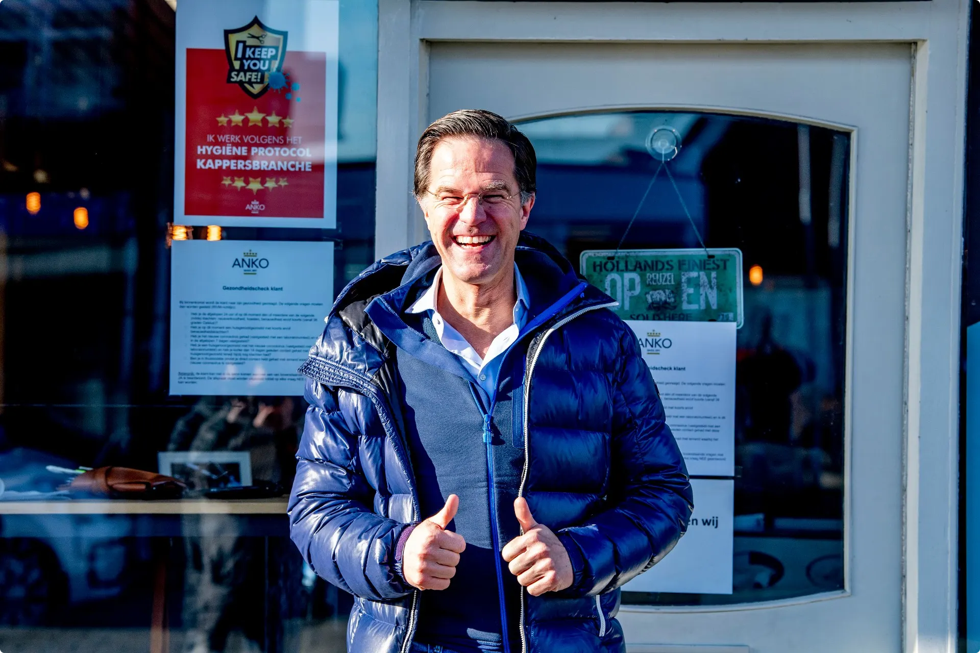 De premier arriveerde in alle vroegte met de auto en met brede glimlach bij zijn vaste kapper in Leidschendam, om zijn coronacoupe onder handen te laten nemen. Onder toeziend oog van een bescheiden publiek. Buiten de salon van Rimmelzwaan stond namelijk een "mannetje of zes" toe te kijken, vertelt de kapper aan Hart van Nederland.