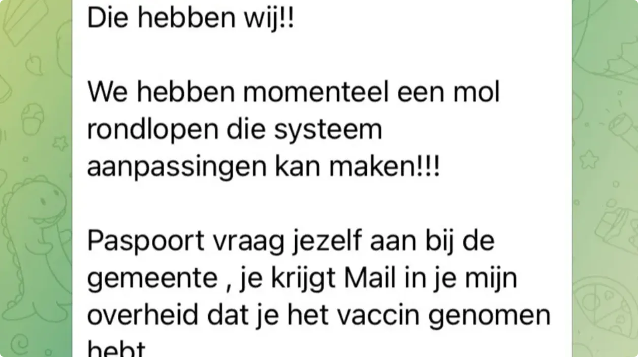 Op de versleutelde berichtendienst Telegram worden via een groot aantal advertenties vaccinatiebewijzen en -registraties aangeboden. Dat blijkt uit onderzoek van Shownieuws. Het gaat om vaccinatiebewijzen om een groen vinkje te krijgen in de CoronaCheck-app en zelfs volledige coronaregistraties. Hiermee zou je zonder een prik toch geregistreerd kunnen worden als volledig gevaccineerd. Ook is het mogelijk om een “geel boekje” aan te schaffen met daarbij een aantekening van de vaccinatie.