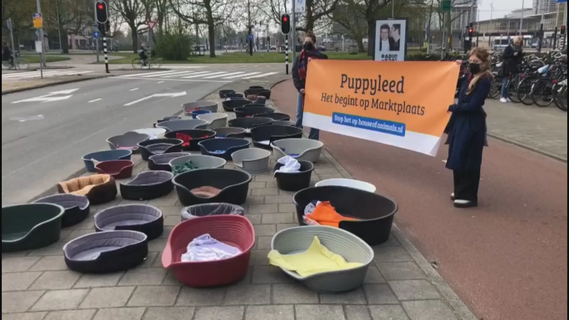 Voor het hoofdkantoor van Marktplaats staan maandagochtend honderd lege hondenmanden. Ze staan symbool voor de overleden puppy's uit de illegale hondenhandel, waartegen dieren welzijnsorganisatie House of Animals tegen protesteert.