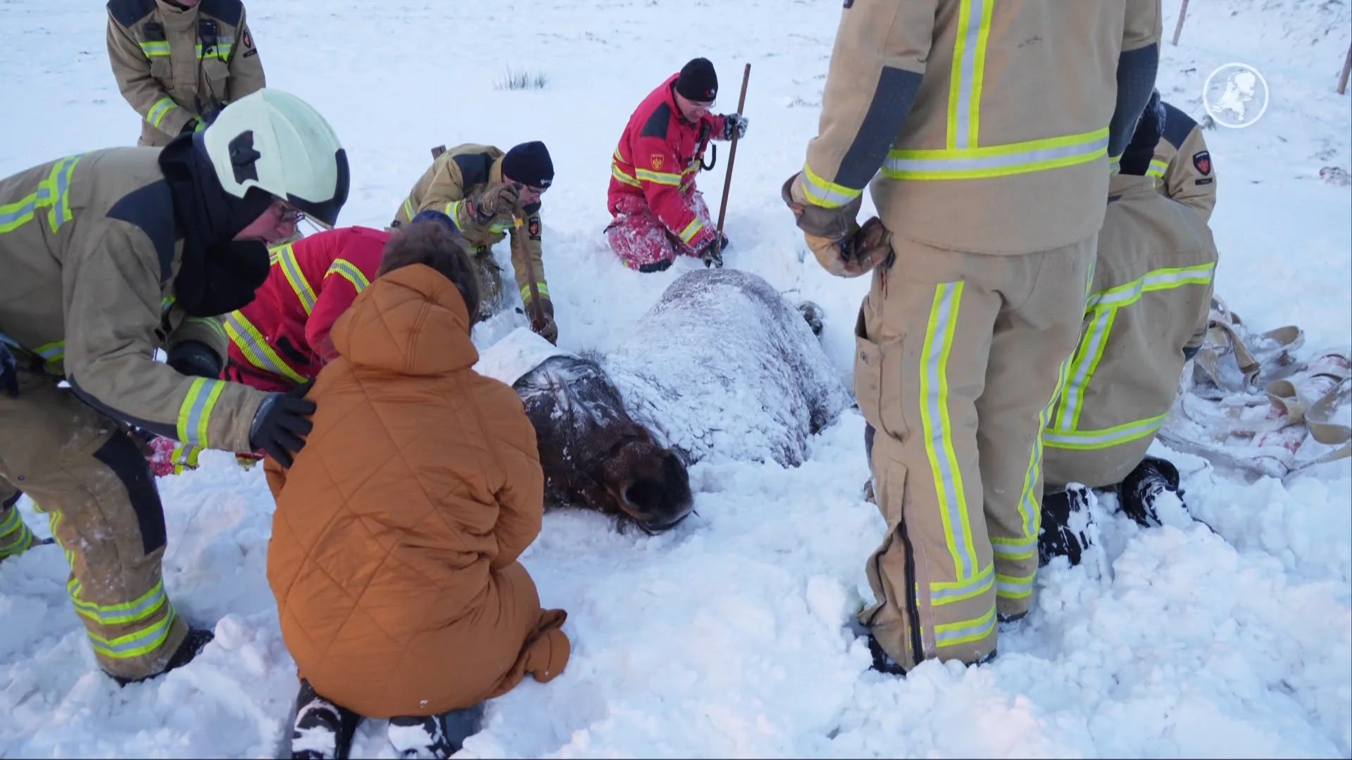Hulpdiensten begonnen direct met het bevrijden van het dier. Brandweerlieden schepten sneeuw weg om bij het paard te komen, maar de redding verliep moeizaam door de winterse omstandigheden. Een hulpverleningskraan kon de plek aanvankelijk niet bereiken vanwege een grote sneeuwduin. Bovendien raakten meerdere brandweermannen vast in de diepe sneeuw, waarna collega’s hen weer uit het sneeuwdek hielpen.
